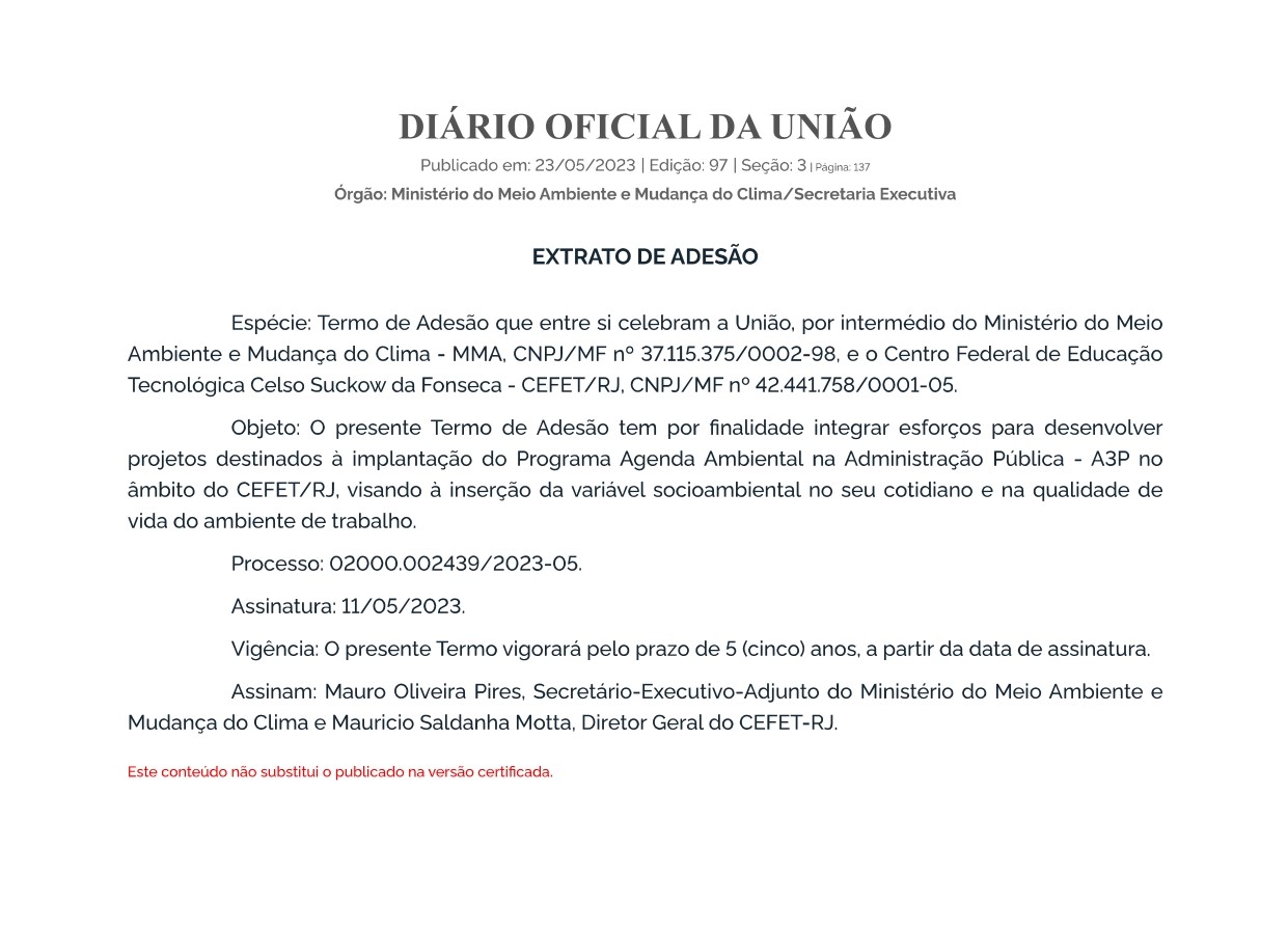 Assim, o CEFET/RJ recebeu a certificação de sustentabilidade do programa AGENDA AMBIENTAL NA ADMINISTRAÇÃO PÚBLICA (A3P), que renova seu compromisso socioambiental com o MMA, que vigorará até maio de 2028.