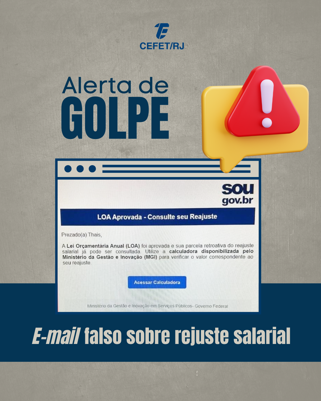 O Departamento de Tecnologia da Informação (DTINF) do Cefet/RJ alerta servidores sobre um e-mail fraudulento que utiliza o nome do Ministério da Gestão e da Inovação em Serviços Públicos (MGI) e a logo do SouGov.Br.
