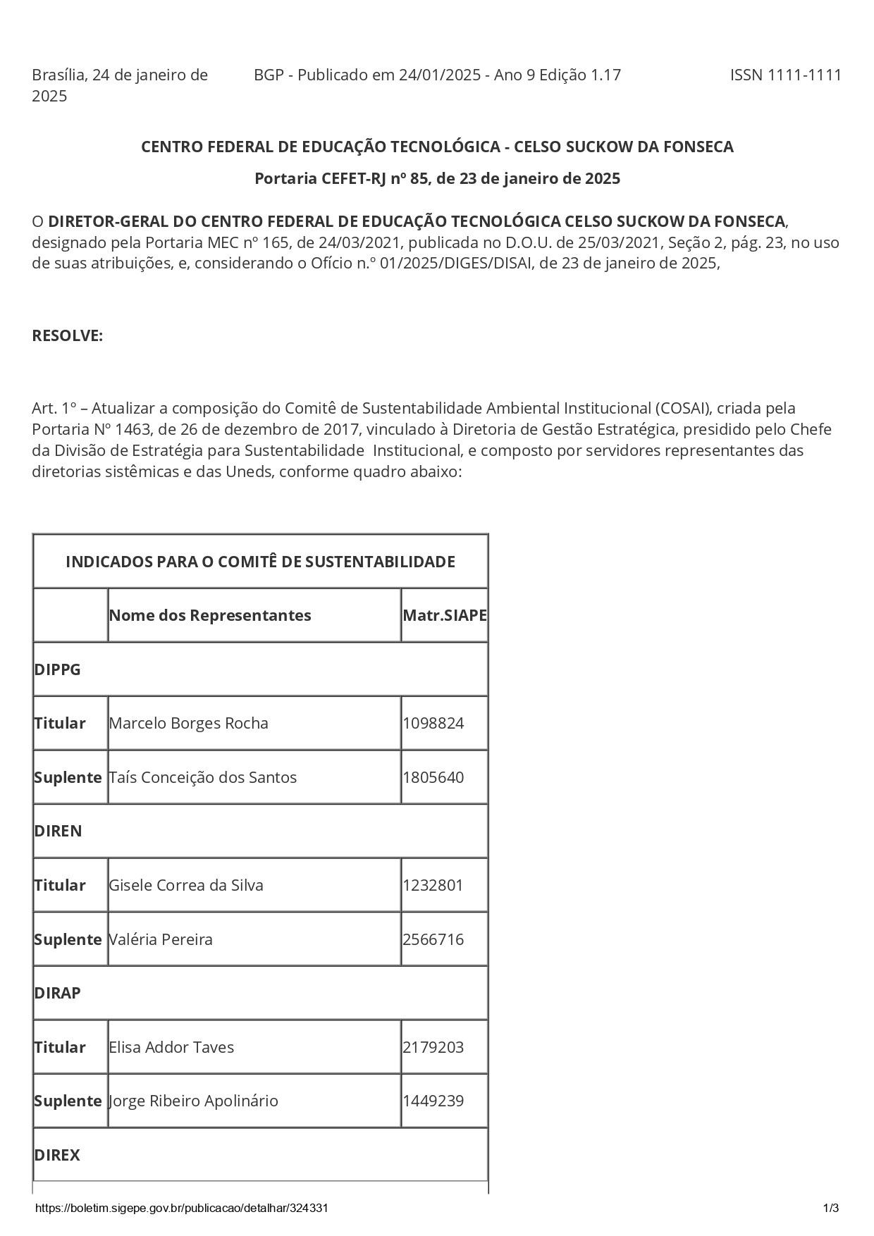 A Criação do COMITÊ DE SUSTENTABILIDADE AMBIENTAL INSTITUCIONAL (COSAI) verificou-se a partir da Portaria 1463, de 26 de Dezembro de 2017. É um órgão colegiado de natureza consultiva e propositiva, de caráter permanente, e apresenta a finalidade de colaborar com a DISAI nas políticas e ações do Cefet/RJ na área de sustentabilidade institucional. É composta por servidores representantes das diretorias sistêmicas do Centro e dos campi.