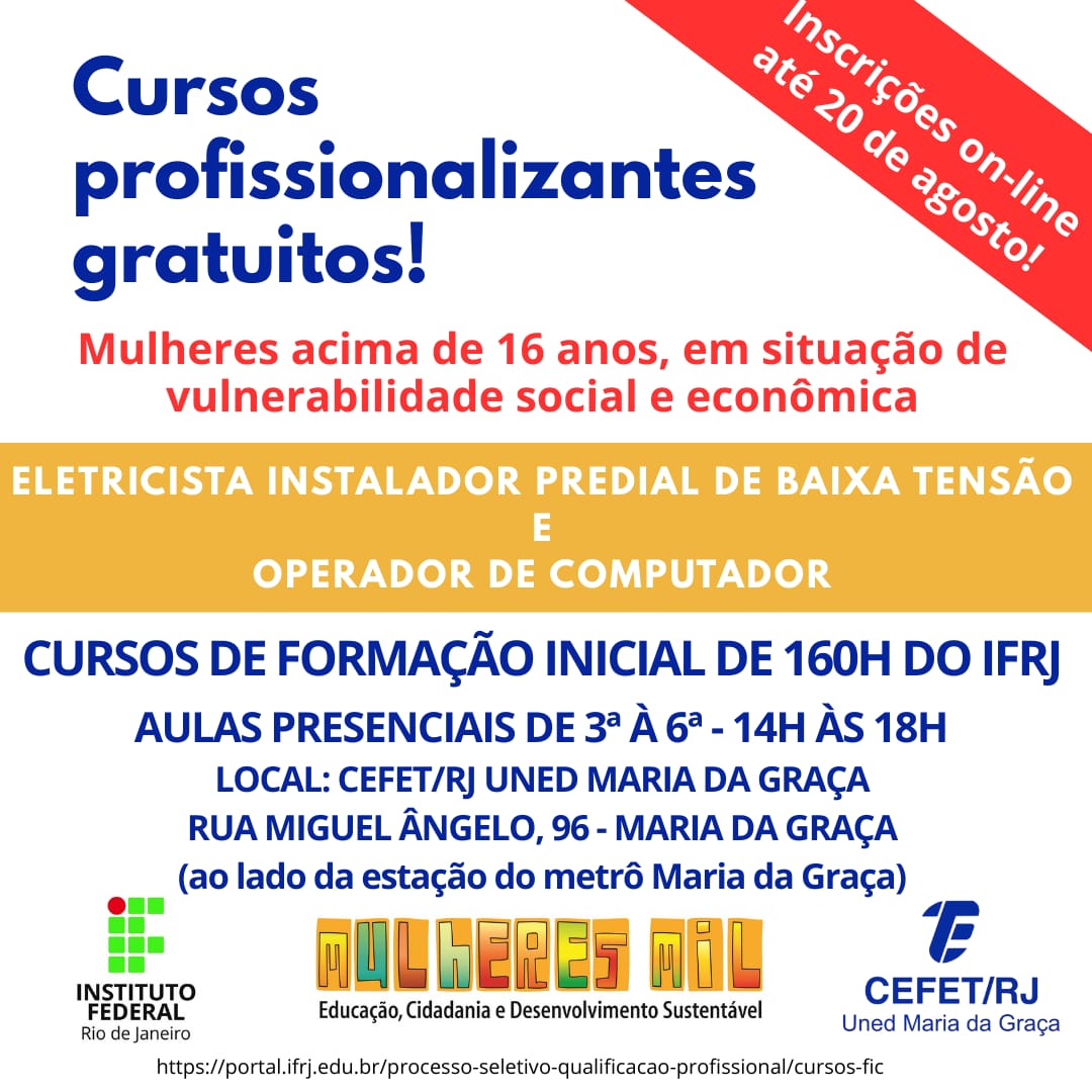 O Cefet/UnED Maria da Graça está oferecendo, em parceria com o IFRJ, Cursos Gratuitos do Programa Mulheres Mil. Objetivo do Programa:...