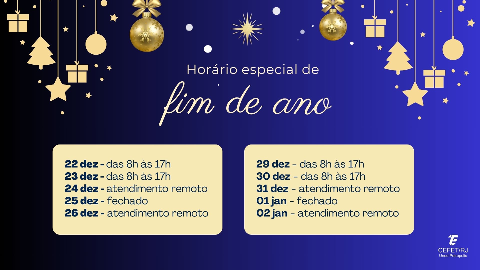 O Cefet/Petrópolis terá um horário de funcionamento especial neste fim de ano.