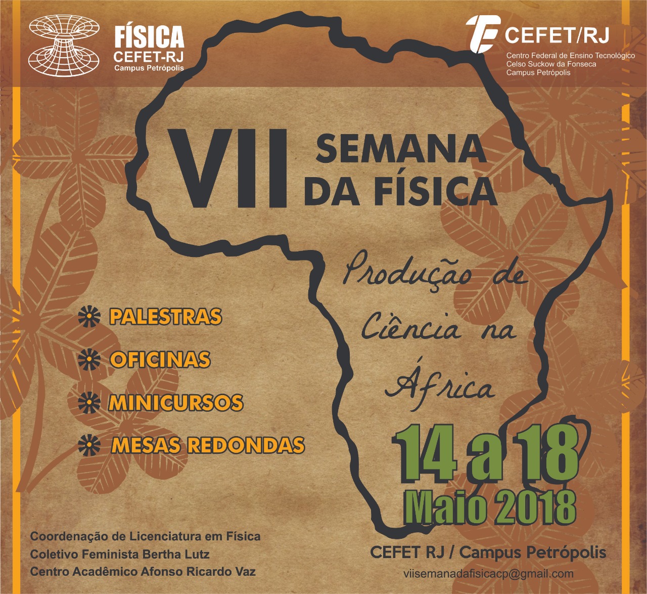 Com a temática voltada para a produção de ciência no continente africano, relacionada à nossa realidade brasileira, a VII Semana de Física irá promover palestras, mesas-redondas e minicursos, entre outras atividades, durante cinco noites no Cefet/RJ campus Petrópolis. Direcionado principalmente para os discentes da Licenciatura em Física, que podem complementar sua formação, o evento é aberto também para os estudantes dos demais cursos da unidade, assim como para a população em geral interessada na área.