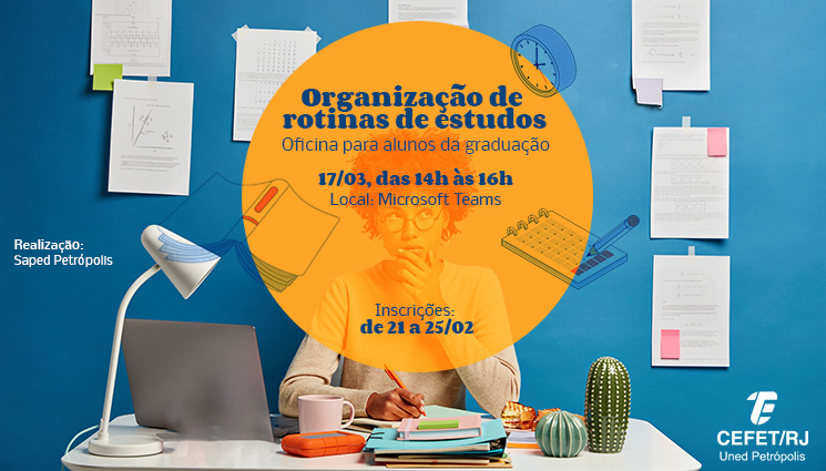 A Seção de Articulação Pedagógica (Saped) do Cefet/RJ Petrópolis vai promover no dia 17 de março, das 14h às 16h, a oficina “Organização de rotinas de estudos”. O evento, que será realizado pela plataforma Microsoft Teams, é voltado para os alunos da graduação da unidade que têm dificuldade em organizar uma rotina que inclua estudos e demandas pessoais.