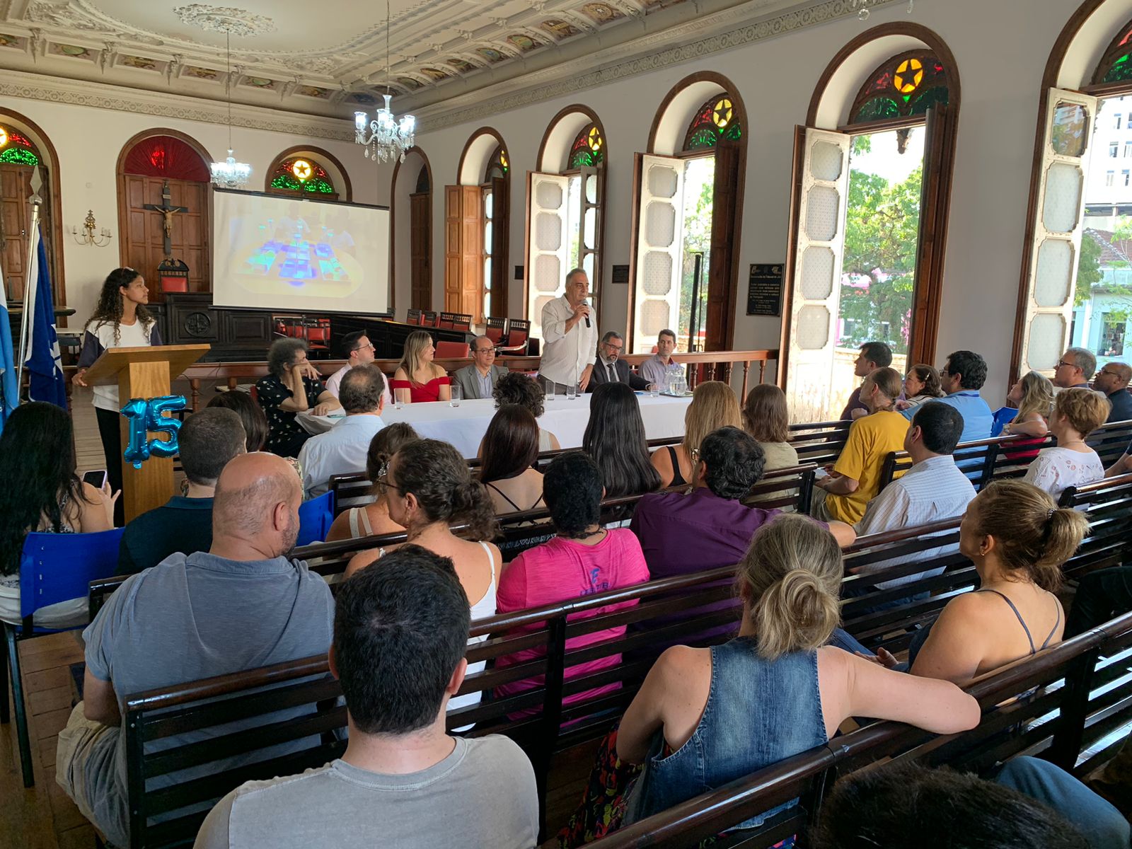 O vice-prefeito de Petrópolis, Paulo Mustrangi, discursa durante sessão solene. Na mesa, estão presentes (da esq. para dir.) Paulo Bittencourt, Frederico Oliveira, Michele Gonzales, Mauricio Motta, Felipe Henriques e Jurair Rosa