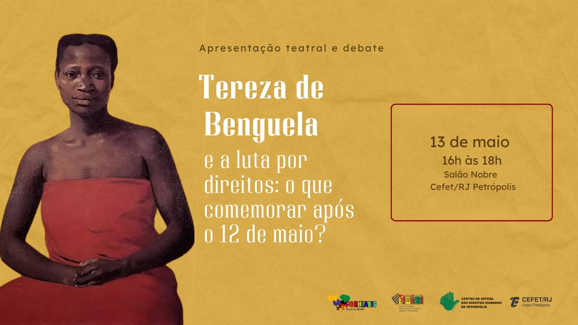 Dia 13 de maio deste ano marca 137 anos da abolição da escravatura no Brasil. Para relembrar e debater a data e seus efeitos, o Núcleo de Estudos Afro-brasileiros e Indígenas (Neabi) e a Comissão para a Promoção de uma Cultura de Paz (ComPaz) do Cefet/RJ Petrópolis promovem o evento "Tereza de Benguela e a luta por direitos: o que comemorar após o 12 de maio?" das 16h às 18h no Salão Nobre da unidade.