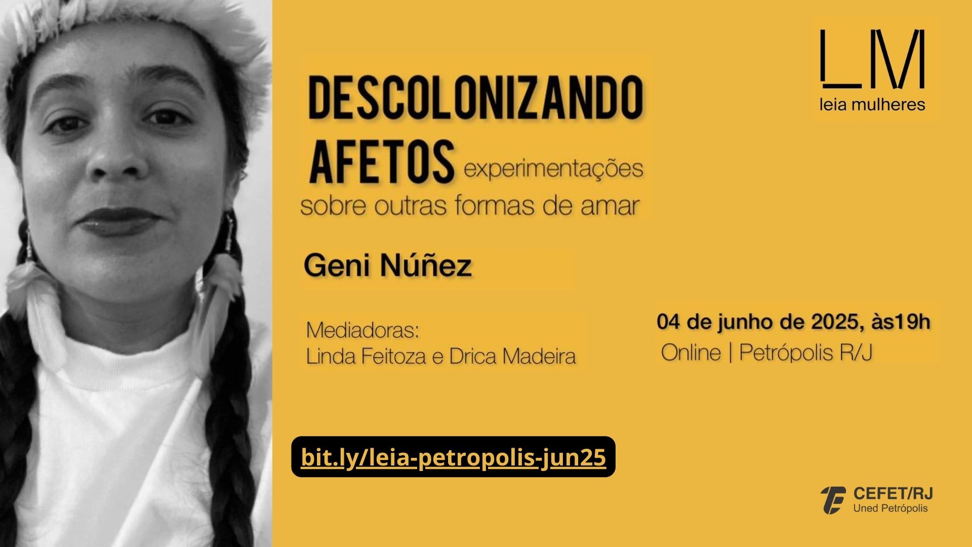 O encontro, que contará com a mediação de Linda Feitoza e Drica Madeira, será on-line no dia 4 de junho, a partir das 19h, pelo Google Meet. Os interessados em participar devem solicitar o link do evento por meio das redes sociais – Leia Mulheres Petrópolis no Instagram e grupo Leia Mulheres Petrópolis-RJ no Facebook.