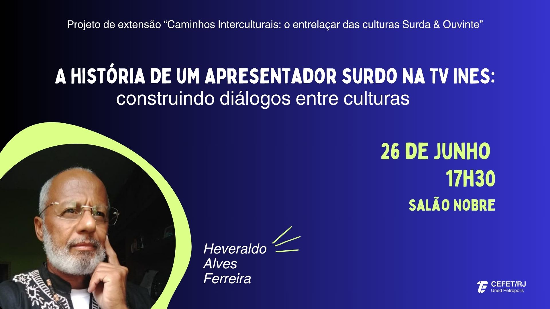 O projeto de extensão “Caminhos Interculturais: o entrelaçar das culturas Surda & Ouvinte”, do Cefet/RJ Petrópolis, realiza no dia 26 de junho a palestra “A história de um apresentador surdo na TV INES: construindo diálogos entre culturas”. O evento, que acontecerá às 17h30 no Salão Nobre, terá como palestrante o professor Heveraldo Alves Ferreira.