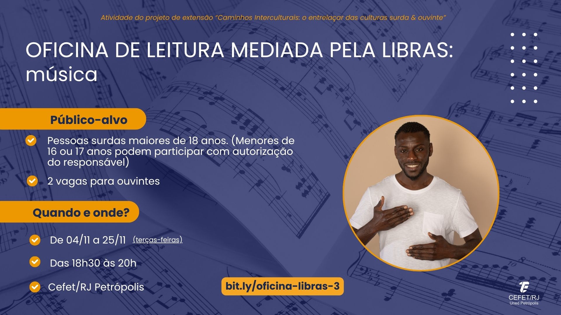 O projeto de extensão “Caminhos Interculturais: o entrelaçar das culturas surda & ouvinte”, do Cefet/RJ Petrópolis, realiza a terceira oficina de leitura voltada para pessoas surdas entre 4 e 25 de novembro. Serão quatro encontros da “Oficina de leitura mediada pela Libras: música”, sempre às terças-feiras, das 18h30 às 20h.