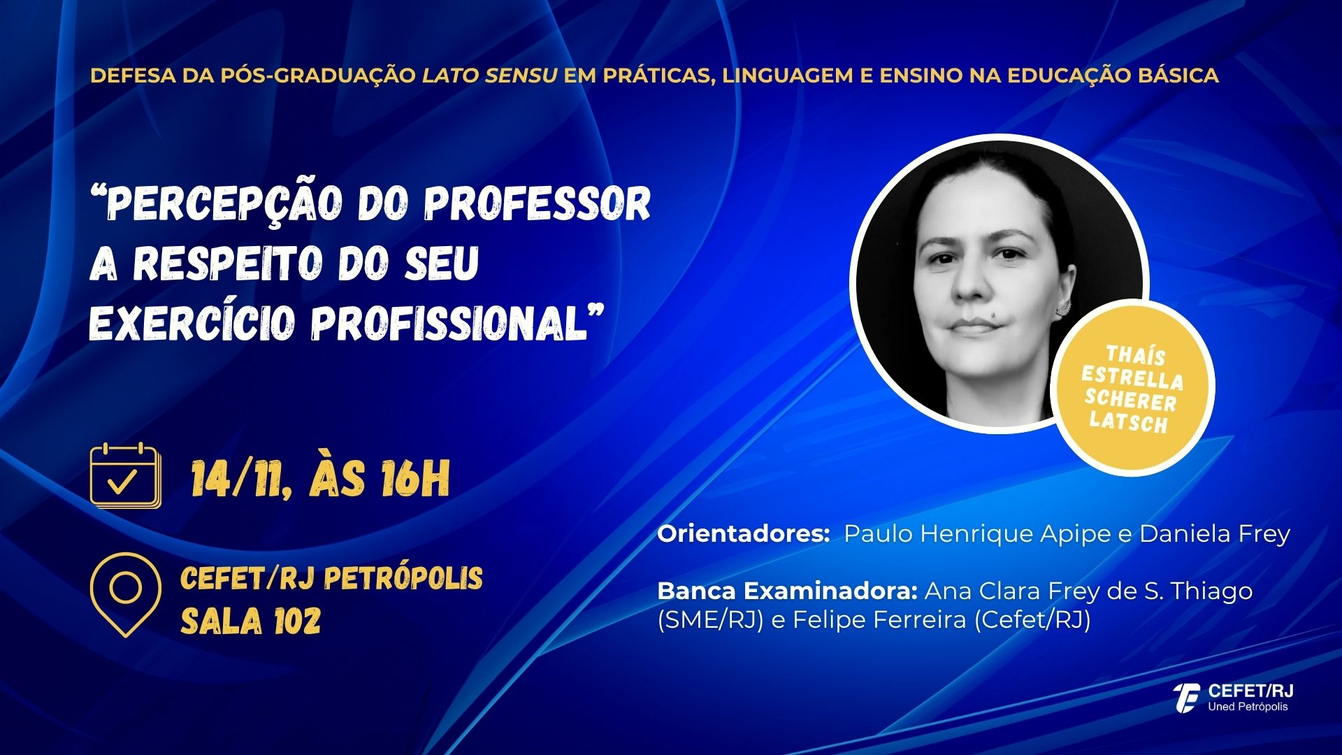 No próximo dia 14 de novembro, o Programa de Pós-Graduação lato sensu em Práticas, Linguagem e Ensino na Educação Básica, do Cefet/RJ Petrópolis, inicia as defesas de conclusão de curso da turma de 2024 com a aluna Thaís Estrella Scherer Latsch.