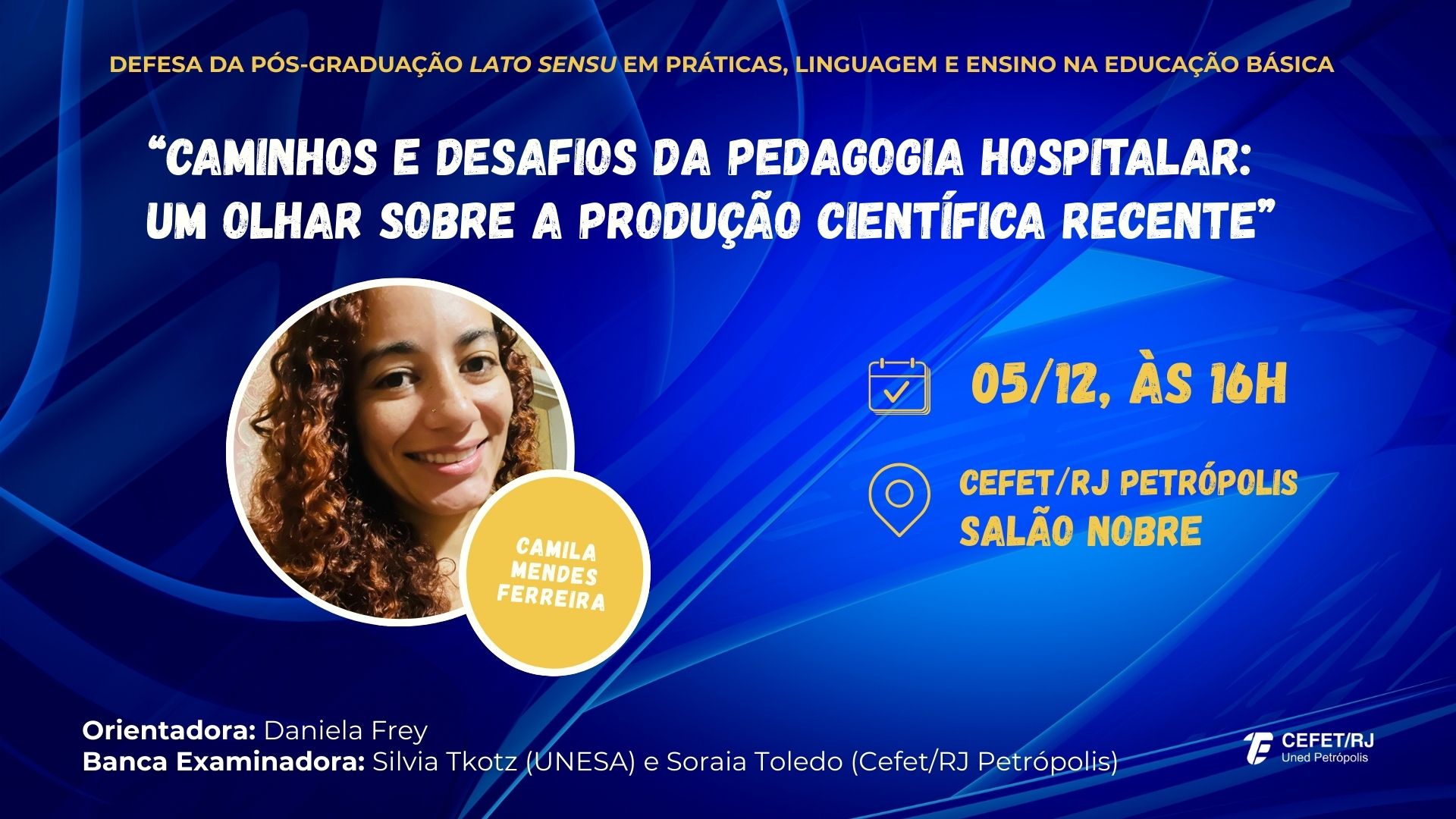 Intitulado "Caminhos e desafios da pedagogia hospitalar: um olhar sobre a produção científica recente", a pesquisa teve a orientação da professora Daniela Frey e terá como banca examinadora as professoras Silvia Tkotz (UNESA) e Soraia Toledo (Cefet/RJ Petrópolis).