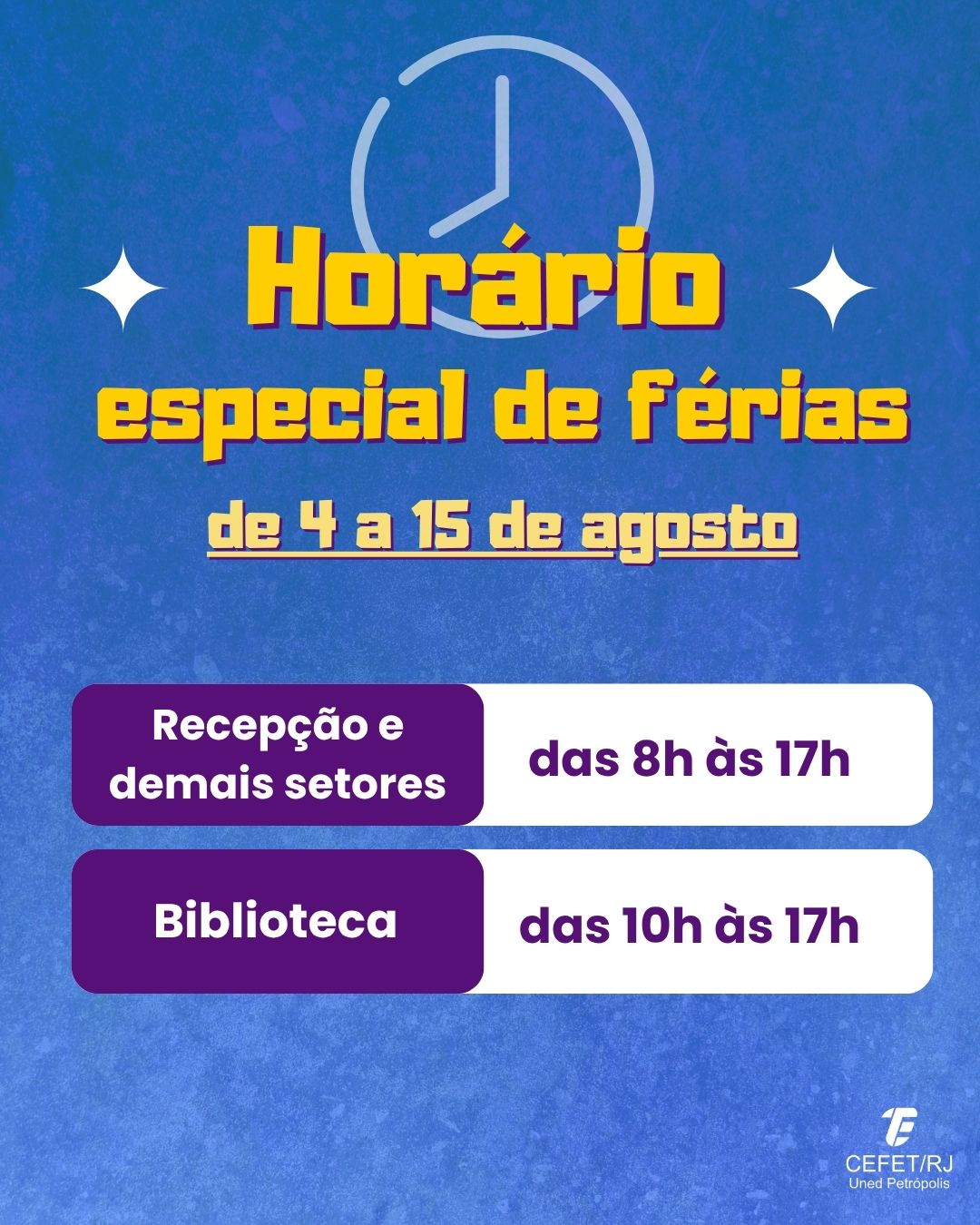 O Cefet/RJ Petrópolis adotará um horário especial de funcionamento para o período de férias acadêmicas, que vai de 4 a 15 de agosto. Confira abaixo: Recepção e demais setores...