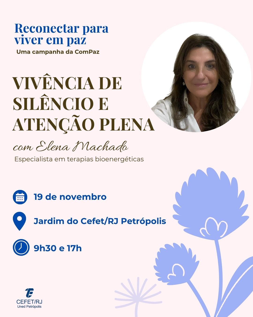 A Comissão Permanente para Promoção de uma Cultura de Paz (ComPaz) do Cefet/RJ Petrópolis realiza no dia 19 de novembro (quarta-feira) a atividade “Vivência de Silêncio e Atenção...