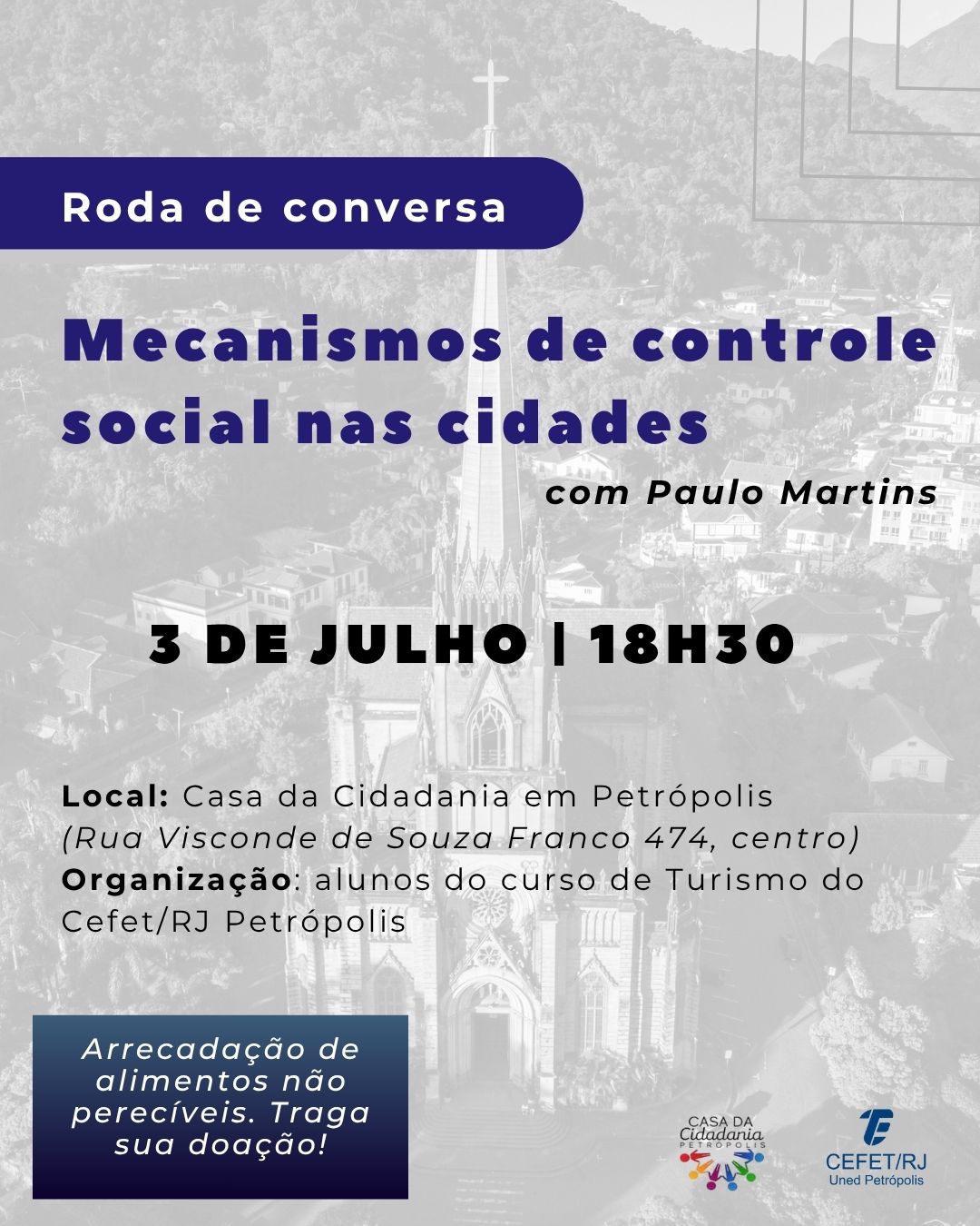 Na quinta-feira, dia 3 de julho, às 18h30, será realizada, na Casa da Cidadania em Petrópolis, a roda de conversa “Mecanismos de controle social nas cidades”. Organizado por alunos...