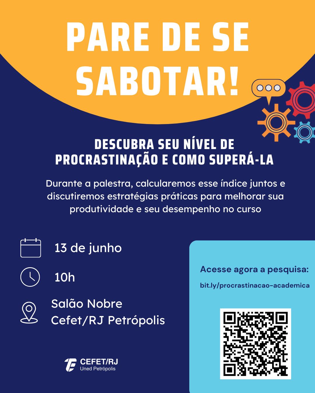 No dia 13 de junho, às 10h, o Salão Nobre do Cefet/RJ Petrópolis recebe a palestra “Pare de se sabotar! Descubra o seu nível de procrastinação e como superá-la”, ministrada...