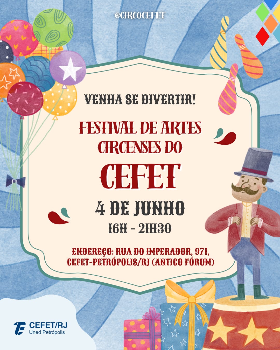 A turma de Gestão de Eventos e Produção Cultural do curso de Bacharelado em Turismo da unidade Petrópolis promove no próximo dia 4 de junho o Festival de Artes Circenses do Cefet/RJ....