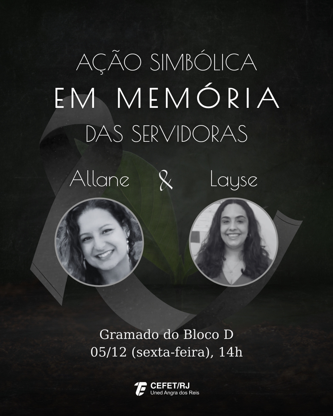 O Cefet/RJ Campus Angra dos Reis realizará, no dia 05 de dezembro de 2025, às 14h, uma ação simbólica em homenagem às servidoras Allane de Souza Pedrotti Mattos e Layse Costa Pinheiro, brutalmente vitimadas no episódio ocorrido na Unidade Maracanã.