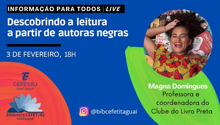 No próximo dia 3 de fevereiro, o projeto de extensão “Informação para todos” realizará a live “Descobrindo a leitura a partir de autoras negras”. A iniciativa é da Biblioteca do Cefet/RJ Uned Itaguaí e será transmitida a partir das 18h pela página @bibcefetitaguai no Instagram. O evento terá como palestrante Magna Domingues, professora e coordenadora do Clube do Livro Preta. A live estava inicialmente marcada para 27/01, mas precisou ser adiada a pedido da convidada.