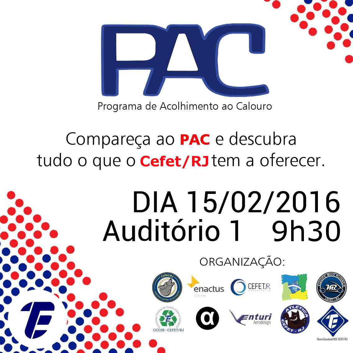 Como em todo primeiro dia de aula do período, o PAC será realizado no Auditório 1, às 9h30 do dia 15 de fevereiro de 2016. O evento é uma grande palestra na qual todos os programas de extensão dão as boas-vindas aos novos alunos e se apresentam, mostrando tudo que o Cefet/RJ tem a oferecer mesmo fora das salas de aula.