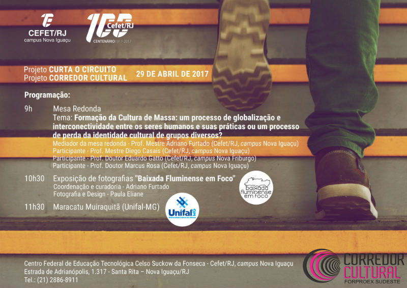 O Núcleo de Arte e Cultura (NAC) realiza, no campus Nova Iguaçu, o evento "Curta o Circuito", como parte das comemorações do centenário do Cefet/RJ. Com início previsto para as 9 horas do dia 29 de abril, a programação contará com uma mesa-redonda com mestres e doutores, além de duas apresentações artísticas. A primeira apresentação será a exposição Baixada Fluminense em Foco, que tem o objetivo de valorizar a região da Baixada Fluminense. No encerramento, ocorrerá uma apresentação do Maracatu Muiraquitã, vinda diretamente da UNIFAL-MG. A participação do grupo mineiro é possível graças ao projeto Corredor Cultural, que viabiliza o intercâmbio entre instituições de ensino superior da região Sudeste.