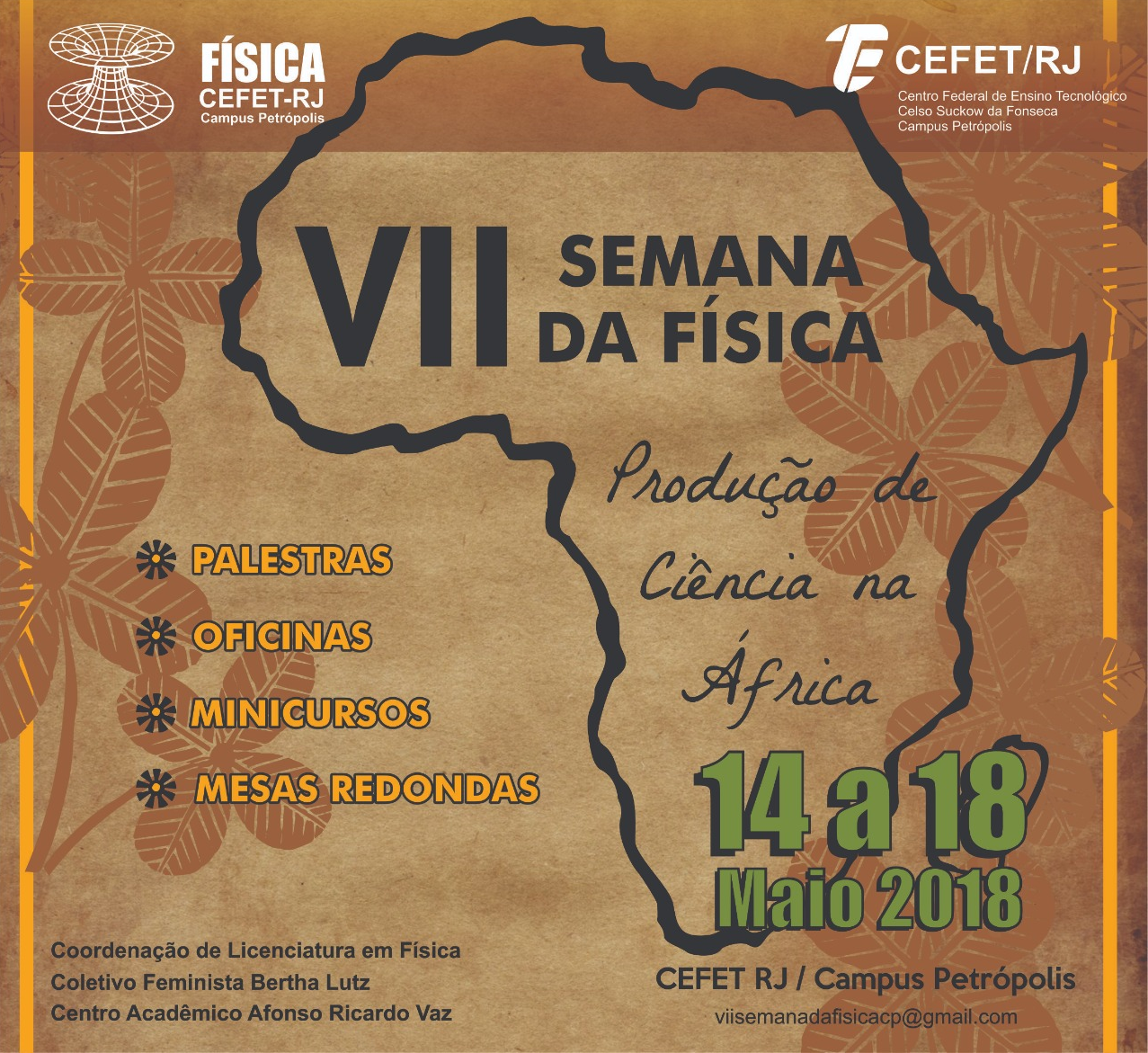 Com a temática voltada para a produção de ciência no continente africano, relacionada à nossa realidade brasileira, a VII Semana de Física irá promover palestras, mesas-redondas e minicursos, entre outras atividades, durante cinco noites no Cefet/RJ campus Petrópolis. Direcionado principalmente para os discentes da licenciatura em Física, que podem complementar sua formação, o evento é aberto também para os estudantes dos demais cursos da unidade, assim como para a população em geral interessada na área.