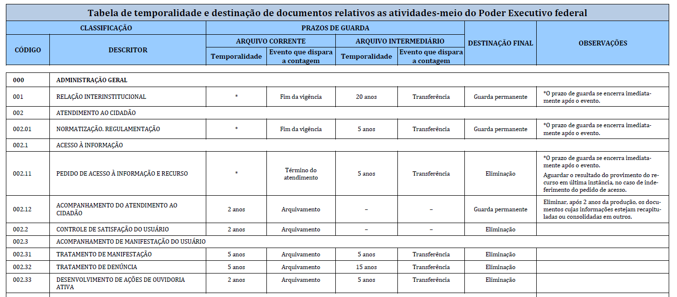 O “Código de classificação e a Tabela de temporalidade e destinação de documentos relativos a atividades-MEIO do Poder Executivo Federal” foi atualizado em 2024 pela equipe técnica do Arquivo Nacional - órgão central do Sistema de Gestão de Documentos e Arquivos (SIGA) - e teve sua nomenclatura modificada para "Código de classificação e tabela de temporalidade e destinação de documentos relativos às atividades-meio/suporte do Poder Executivo federal".