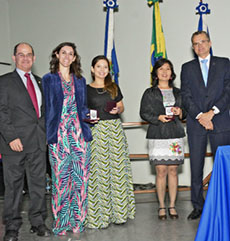 Logo após a abertura do evento, com os pronunciamentos do diretor-geral do Cefet/RJ, Carlos Henrique Figueiredo Alves, e do presidente da Comissão do Centenário, Mauricio Saldanha Motta, o representante da Casa da Moeda, Jehovah de Araújo Silva Júnior, realizou a entrega das medalhas comemorativas. Foram agraciados o diretor Carlos Henrique e o vice-diretor Mauricio Motta, além das três funcionárias responsáveis pelo design da medalha: Érika Takeyama, da Casa da Moeda, e Isabela Devonish e Thaís Pires Alves, ambas da Divisão de Programação Visual do Cefet/RJ. A servidora Valdete Barbosa, responsável pelo Arquivo do Cefet/RJ, também recebeu uma medalha para compor o acervo da instituição.