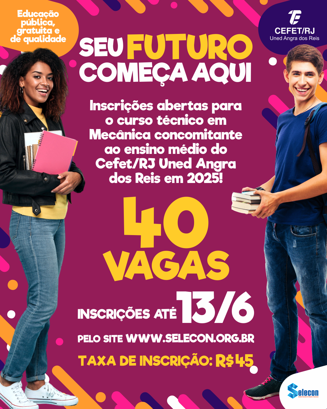 A Uned Angra dos Reis abriu edital para seleção de alunos para o curso técnico em Mecânica na modalidade concomitância externa. São oferecidas 40 vagas no total, sendo 20 para ampla concorrência e 20 para candidatos que cursaram integralmente o ensino fundamental na rede pública, distribuídos entre oito grupos, conforme edital.