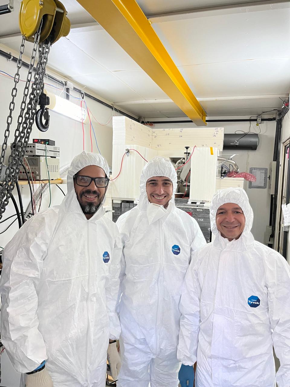 Pesquisadores do experimento CONNIE usando roupas de proteção devido ao manuseio do chumbo para a blindagem dos detectores. Da esq. para a dir.: Aldo Rosado (Cefet/RJ), Miguel Sofo Haro (Centro Atómico Bariloche) e Martin Makler