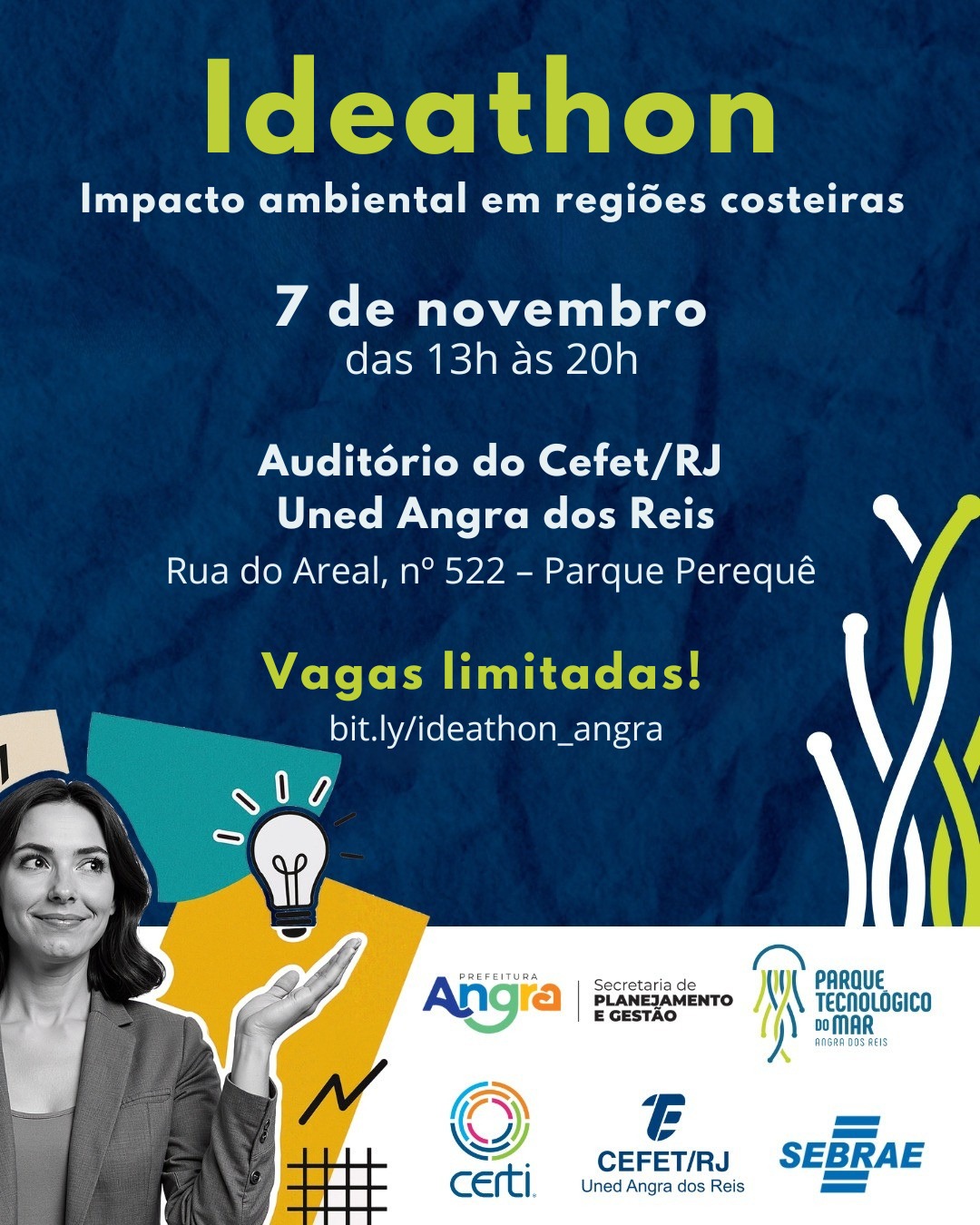 No dia 7 de novembro, o Cefet/RJ Uned Angra dos Reis vai sediar o evento Ideathon, com o tema “Impacto Ambiental em Regiões Costeiras”. A proposta é promover uma maratona de geração de ideias para desafios ambientais reais da região da Costa Verde (RJ), utilizando a metodologia do Sebrae. O evento será realizado das 13h às 20h, no auditório da unidade.