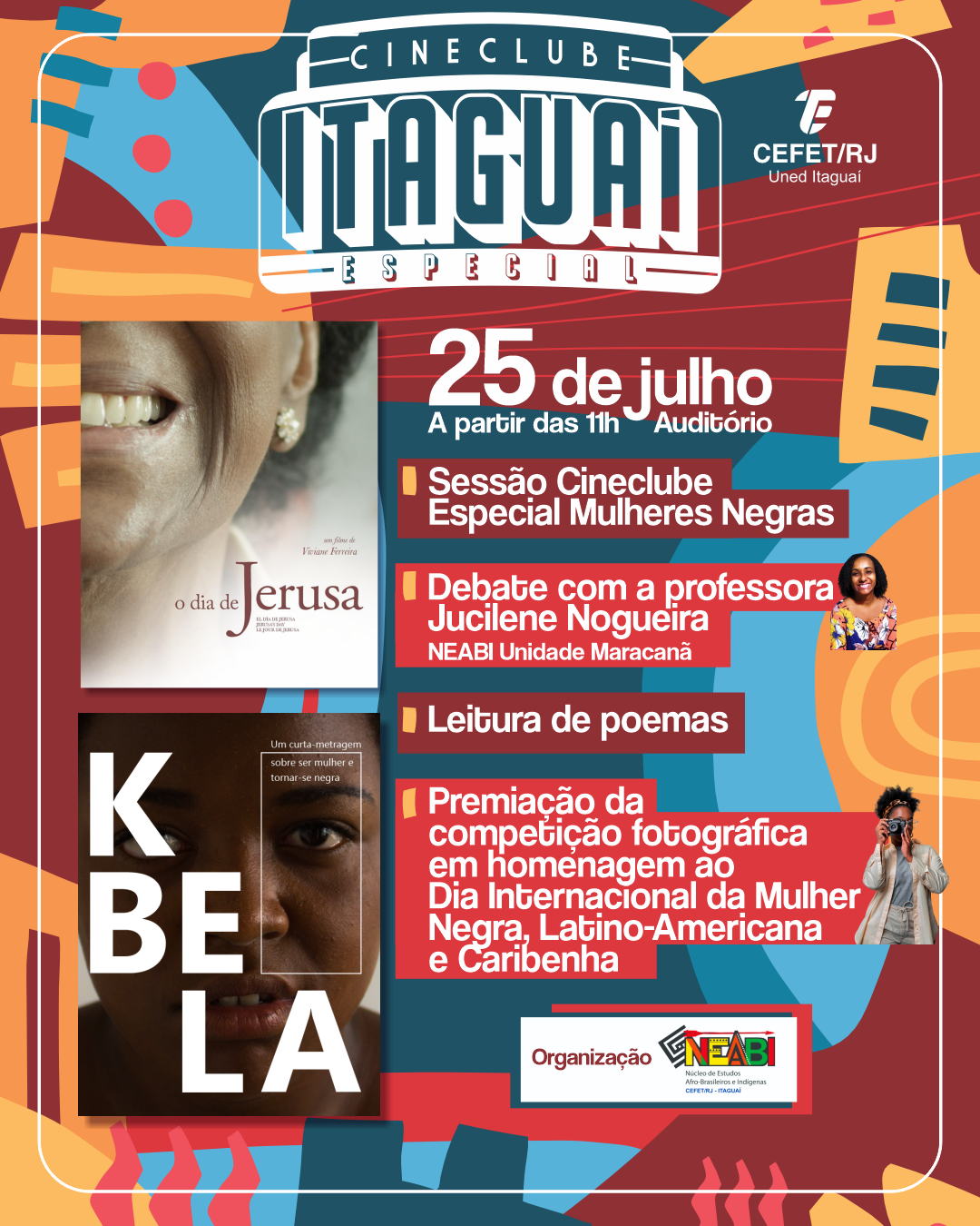Exibição de filmes, leitura de poesias, debates e premiação de um concurso de fotografia integram a programação do evento em homenagem ao Dia Internacional da Mulher Negra Latino-Americana e Caribenha no Cefet/RJ Uned Itaguaí. A atividade será realizada na próxima sexta-feira (25), das 11h às 13h, no auditório da unidade. A iniciativa foi organizada pelo Núcleo de Estudos Afro-Brasileiros e Indígenas (NEABI) da Uned Itaguaí em conjunto com o Cineclube Itaguaí e em parceria com o projeto de extensão “Ações afirmativas na construção de uma escola antirracista".