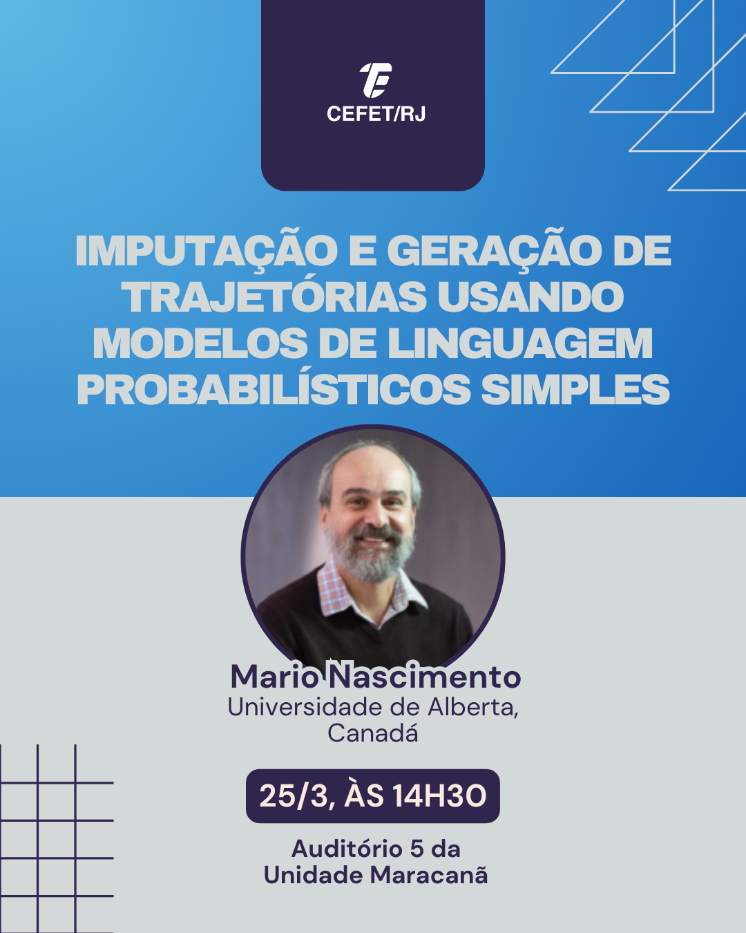 Nesta quarta-feira (25), às 14h30, o Laboratório de Análise de Dados (Data Analytics Lab – DAL), do Departamento de Ciência da Computação do Cefet/RJ, realiza a palestra “Imputação e geração de trajetórias usando modelos de linguagem probabilísticos simples”, ministrada por Mario Nascimento, professor emérito da Universidade de Alberta (Canadá). O objetivo é demonstrar como modelos de linguagem podem reconstruir dados de trajetórias coletados por GPS. O evento será realizado no Auditório 5 da Unidade Maracanã.