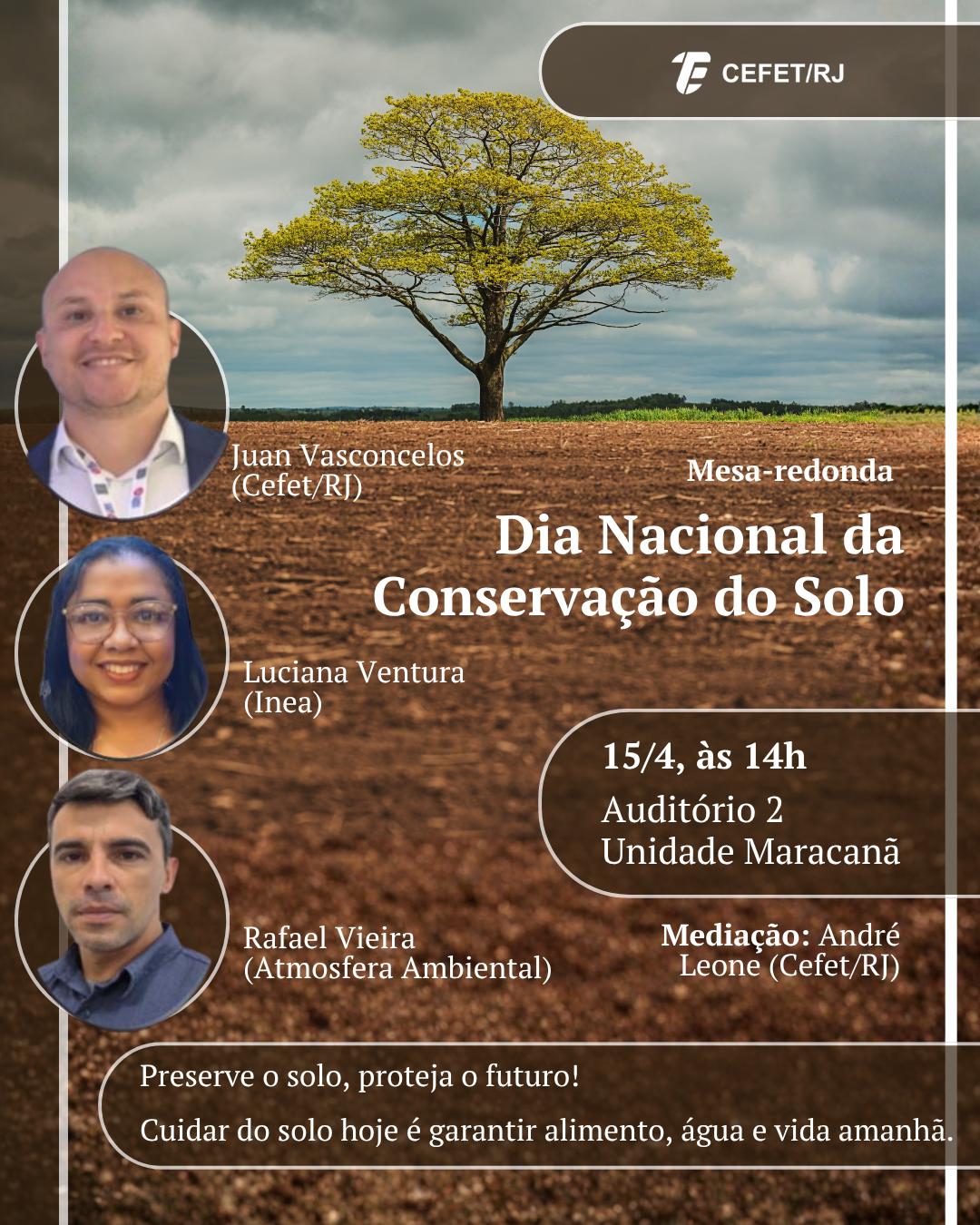 No dia 15 de abril, a Coordenação da Engenharia Ambiental (CEAMB) e a Divisão de Sustentabilidade Ambiental e Institucional (DISAI/DEDIN/DIGES) promoverão uma mesa-redonda pelo Dia Nacional da Conservação do Solo. A atividade, mediada pelo professor do Cefet/RJ André Leone, acontecerá às 14h, no Auditório 2 da Unidade Maracanã. É necessário realizar inscrição prévia pelo formulário.