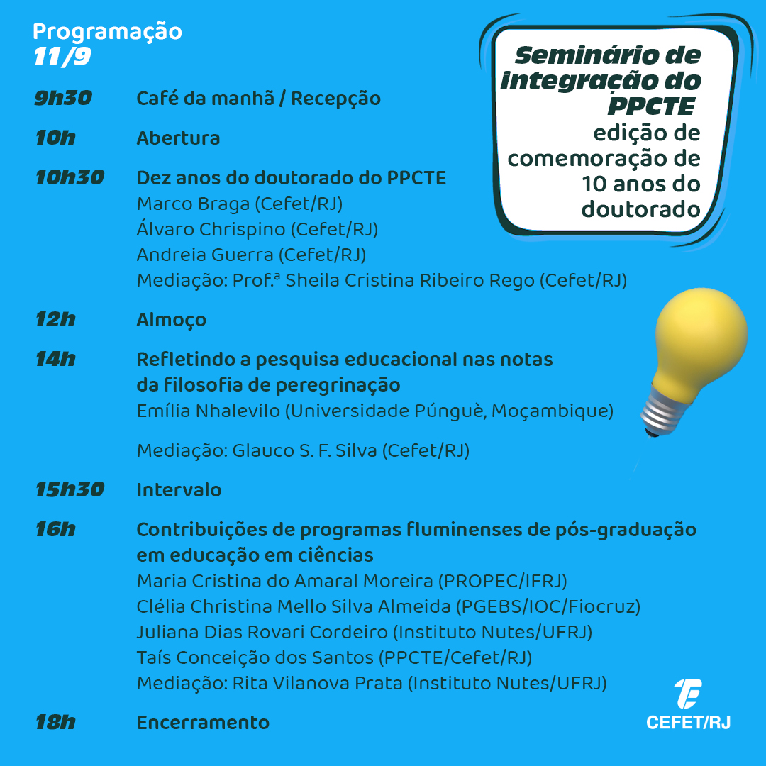 Nos dias 11 e 12 de setembro, o Programa de Pós-Graduação em Ciência, Tecnologia e Educação (PPCTE) irá promover o “Seminário de integração do PPCTE: edição de comemoração de 10 anos do doutorado”, com o propósito de celebrar o primeiro curso de doutorado implantado pelo Cefet/RJ. O evento acontecerá no Auditório 5 da Unidade Maracanã e não será necessário realizar inscrição prévia. Os participantes terão direito a certificado.