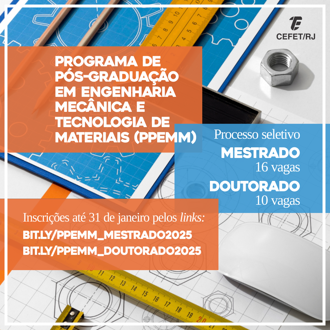 O Cefet/RJ está com inscrições abertas, até 31 de janeiro, para o Programa de Pós-Graduação em Engenharia Mecânica e Tecnologia de Materiais (PPEMM), com ingresso no primeiro trimestre de 2025. Ao todo, serão selecionados 16 candidatos para o mestrado e 10 para o doutorado, com vagas distribuídas entre ampla concorrência e ações afirmativas. Os cursos são ofertados na Unidade Maracanã.