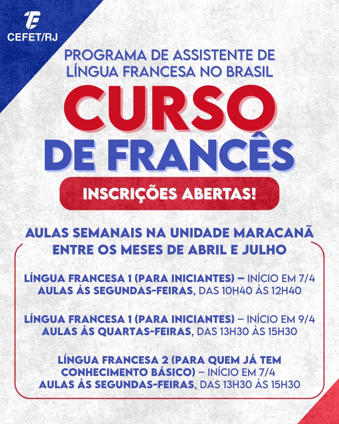 A iniciativa é fruto de uma parceria entre o Cefet/RJ e a Embaixada da França e está aberta à comunidade acadêmica e ao público externo. Os candidatos selecionados receberão a confirmação da vaga e as informações adicionais sobre o curso por e-mail. A coordenação do programa pede que aqueles que não forem contatados evitem comparecer ao local das aulas ou enviar e-mails adicionais.