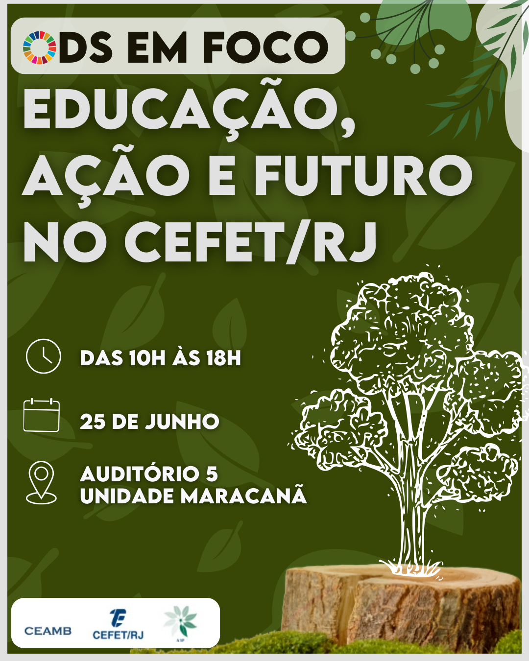 No dia 25 de junho, a Unidade Maracanã promoverá um dia inteiro de atividades com exposição de projetos, oficinas e palestras para apresentar e discutir as posturas e práticas de sustentabilidade, alinhadas aos Objetivos de Desenvolvimento Sustentável (ODS) estabelecidos pela Assembleia Geral das Nações Unidas. Intitulado “ODS em foco: educação, ação e futuro no Cefet/RJ”, o evento, aberto para participação do público em geral, é organizado por alunos e professores do Cefet/RJ e conta com o apoio da Divisão de Estratégia para Sustentabilidade Ambiental Institucional (DISAI) e da Coordenação do Curso de Engenharia Ambiental (CEAMB). Clique aqui para acessar o formulário de inscrição.