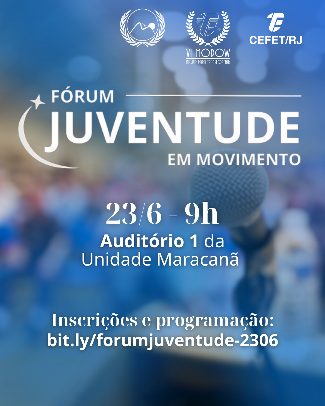 Com o objetivo de debater e refletir sobre os principais desafios enfrentados pela juventude brasileira na atualidade, o projeto Modow, do Cefet/RJ Unidade Maracanã, vai promover o Fórum Juventude em Movimento. O evento é voltado para estudantes de ensino médio e superior interessados nas temáticas sociais e políticas relacionadas à juventude. O encontro acontece na próxima segunda-feira (23), a partir das 9h, no Auditório 1 da unidade. As inscrições são gratuitas e podem ser feitas pelo link bit.ly/forumjuventude-2306.