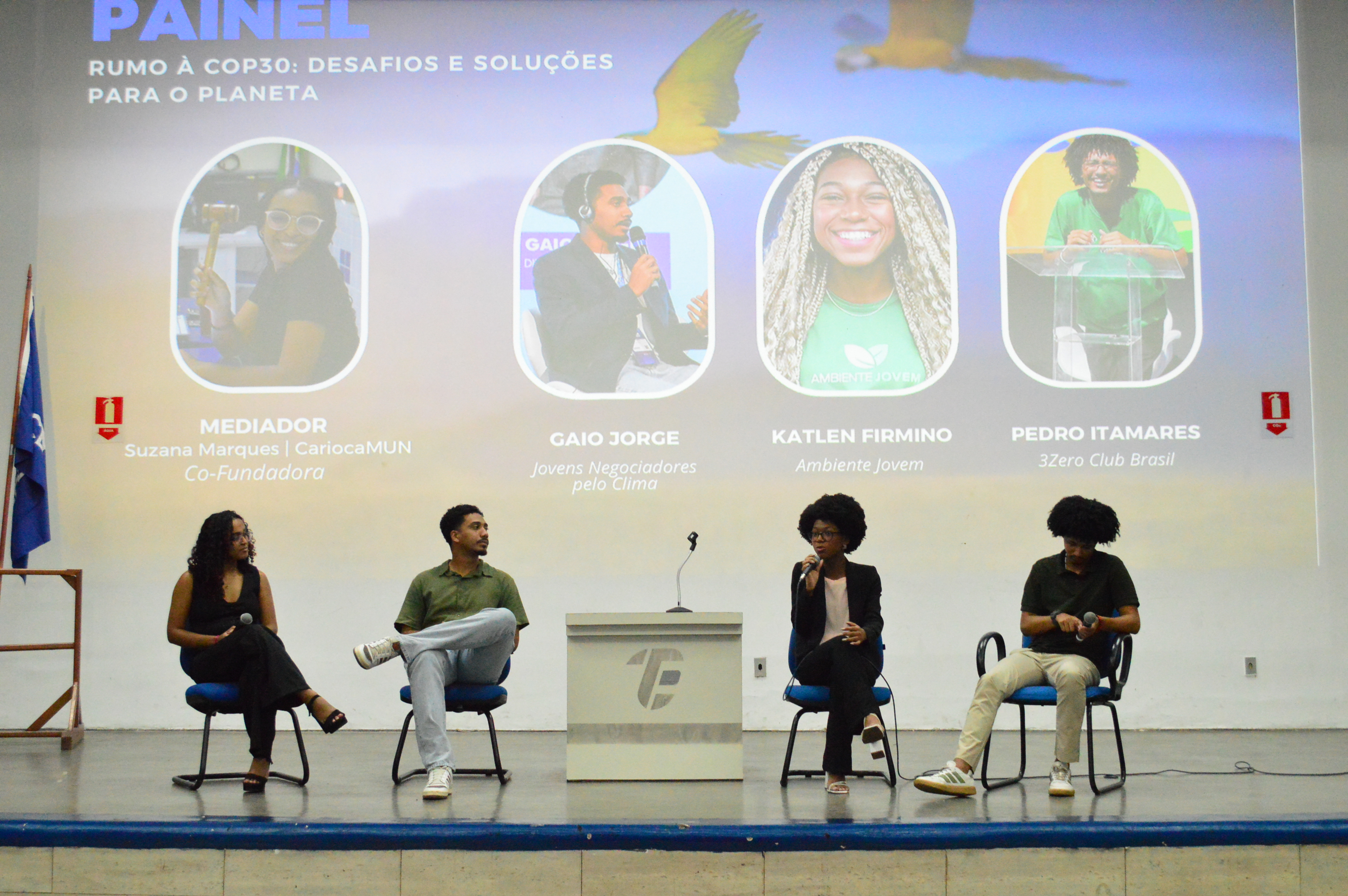 Na parte da tarde, a programação contou com diversas palestras. O painel “Horizontes” teve apresentações de Alessandra Santos, gestora pública e coordenadora de apoio à Gestão Escolar da Secretaria Municipal de Educação do Rio de Janeiro, Diogo Campos, coordenador do Espaço da Juventude da Secretaria Especial da Juventude Carioca (JUV-RIO), Alef Martins, representante da JUV-RIO no Comitê Agenda Cidade UNICEF, Maria Eduarda Freitas, cofundadora da CariocaMUN e ativista pela educação. Já o painel “Rumo à COP30” teve as participações de Pedro Itamares, comunicador socioambiental, negociador climático e pesquisador de advocacy DH e meio ambiente, Gaio Jorge, engenheiro de alimentos e negociador climático, Tainá de Paula, secretária de Meio Ambiente e Clima da cidade do Rio de Janeiro, e Cauê Ranif, fundador da YAAP Brasil. O último painel, “Vozes que ecoam”, contou com a presença de Gabriella Rodrigues, secretária municipal de Juventude, Charlie Gomes, fundador da Rocinha Comunic, parlamentar, jornalista em formação e ativista climático, e Suzana Marques, cofundadora da CariocaMUN e ativista.