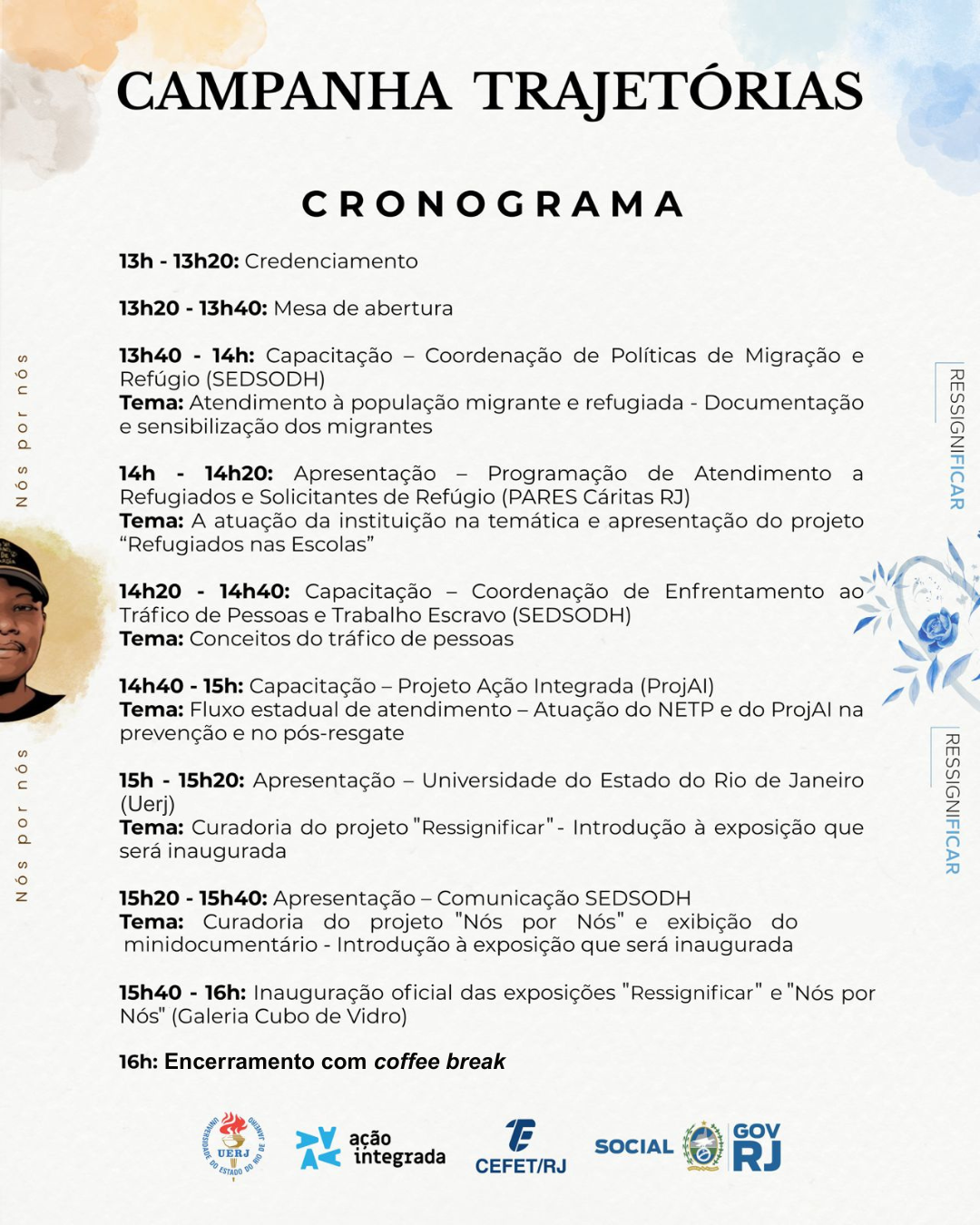 A programação do dia inclui apresentações e capacitações diversas que versam sobre temas como direitos humanos e a situação dos migrantes e dos refugiados. As atividades terão início às 13h30, no Auditório 2, e são abertas a estudantes, a servidores e à comunidade. A inauguração da mostra está marcada para as 15h40.