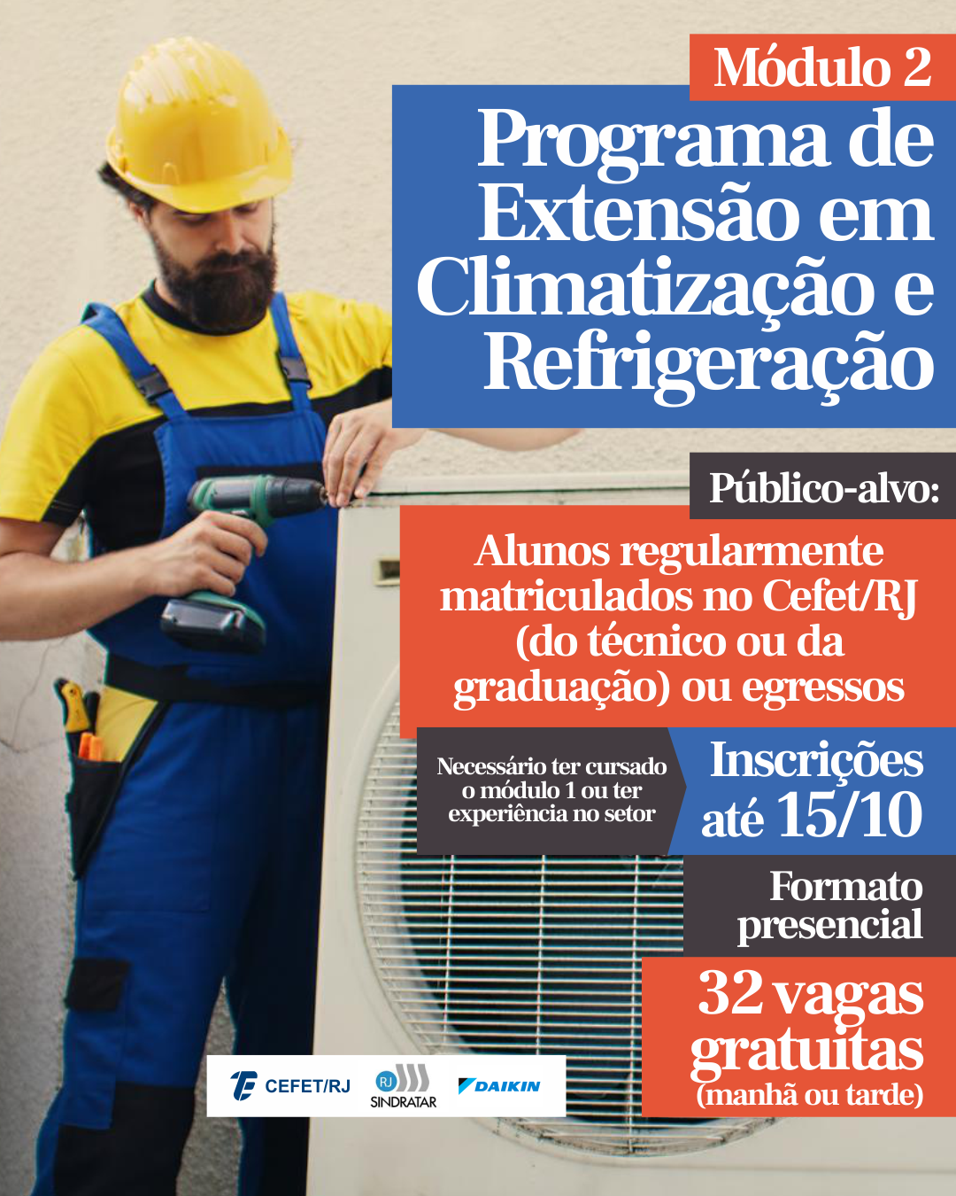O programa de extensão é realizado em parceria com o Sindicato da Indústria de Refrigeração, Aquecimento e Tratamento de Ar do Estado do Rio de Janeiro (Sindratar-RJ), com patrocínio da Daikin Brasil. Os módulos são presenciais e serão ministrados na sede do Sindratar-RJ, próximo à Unidade Maracanã, a partir de 21 de outubro. Para se inscrever, os interessados devem enviar um e-mail para O endereço de e-mail address está sendo protegido de spambots. Você precisa ativar o JavaScript enabled para vê-lo., no caso de candidatos do ensino técnico, ou para O endereço de e-mail address está sendo protegido de spambots. Você precisa ativar o JavaScript enabled para vê-lo., no caso de candidatos da graduação.