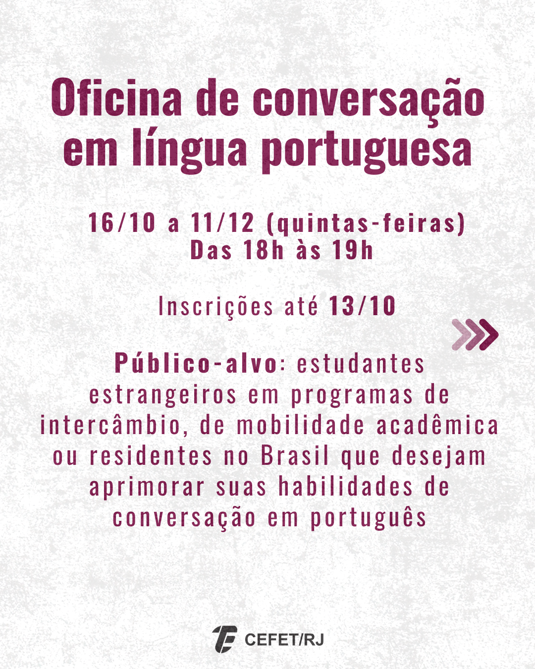 A “Oficina de conversação em língua portuguesa”, com o objetivo de desenvolver a oralidade e a comunicação de estudantes estrangeiros em situações do cotidiano brasileiro, está com inscrições abertas até 13 de outubro. As aulas acontecerão às quintas-feiras, de 16 de outubro a 11 de dezembro, das 18h às 19h, de forma remota, por meio da plataforma Microsoft Teams. Clique aqui para fazer sua inscrição.