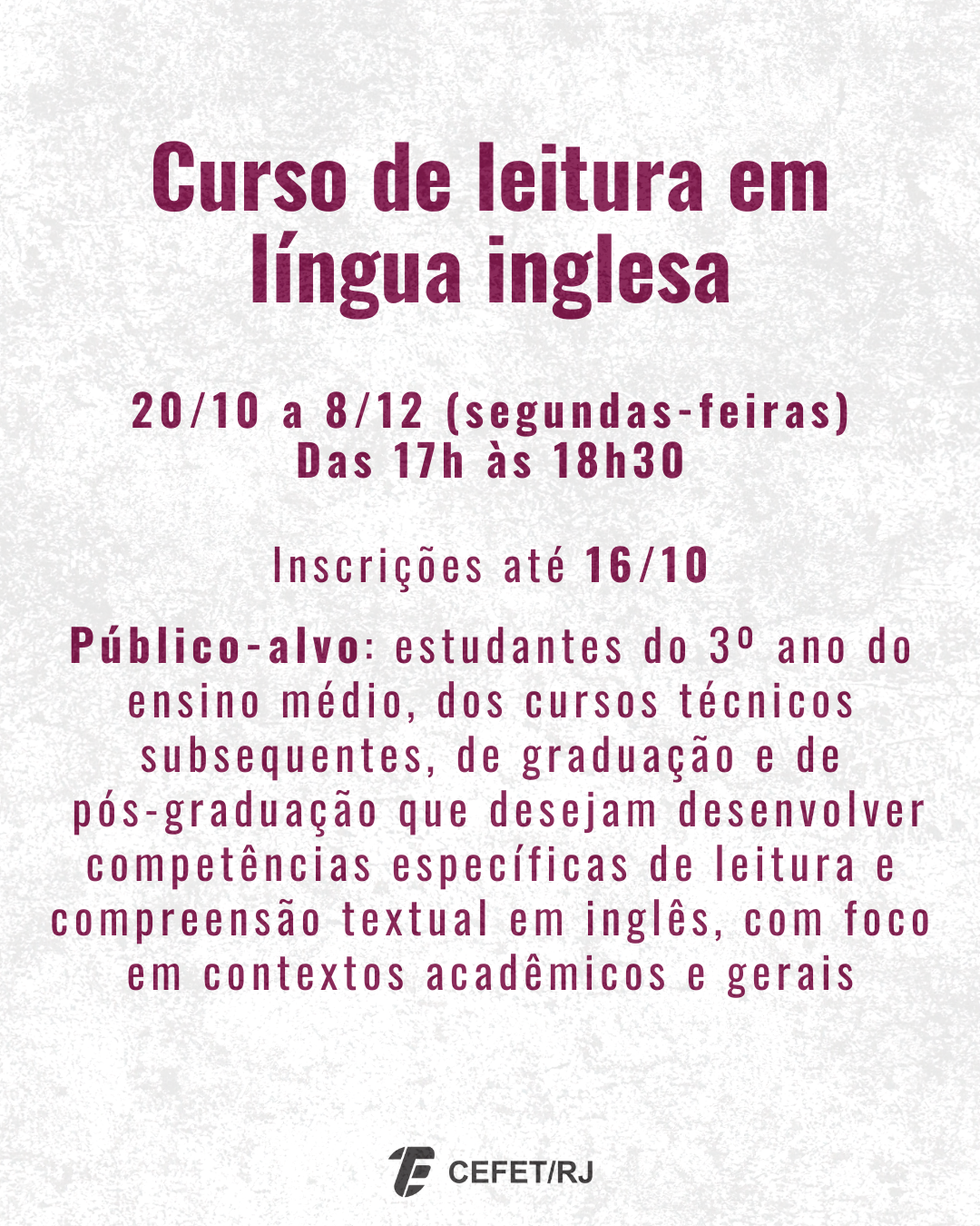 Já o “Curso de leitura em língua inglesa” está com inscrições abertas até o dia 16 de outubro. O público-alvo são, prioritariamente, os estudantes do 3º ano do ensino médio, dos cursos técnicos subsequentes, de graduação e de pós-graduação que desejam desenvolver competências específicas de leitura e compreensão textual em inglês, com foco em contextos acadêmicos e gerais. As aulas acontecerão às segundas-feiras, de 20 de outubro a 8 de dezembro, das 17h às 18h30, por meio da plataforma Microsoft Teams. Clique aqui para se inscrever.