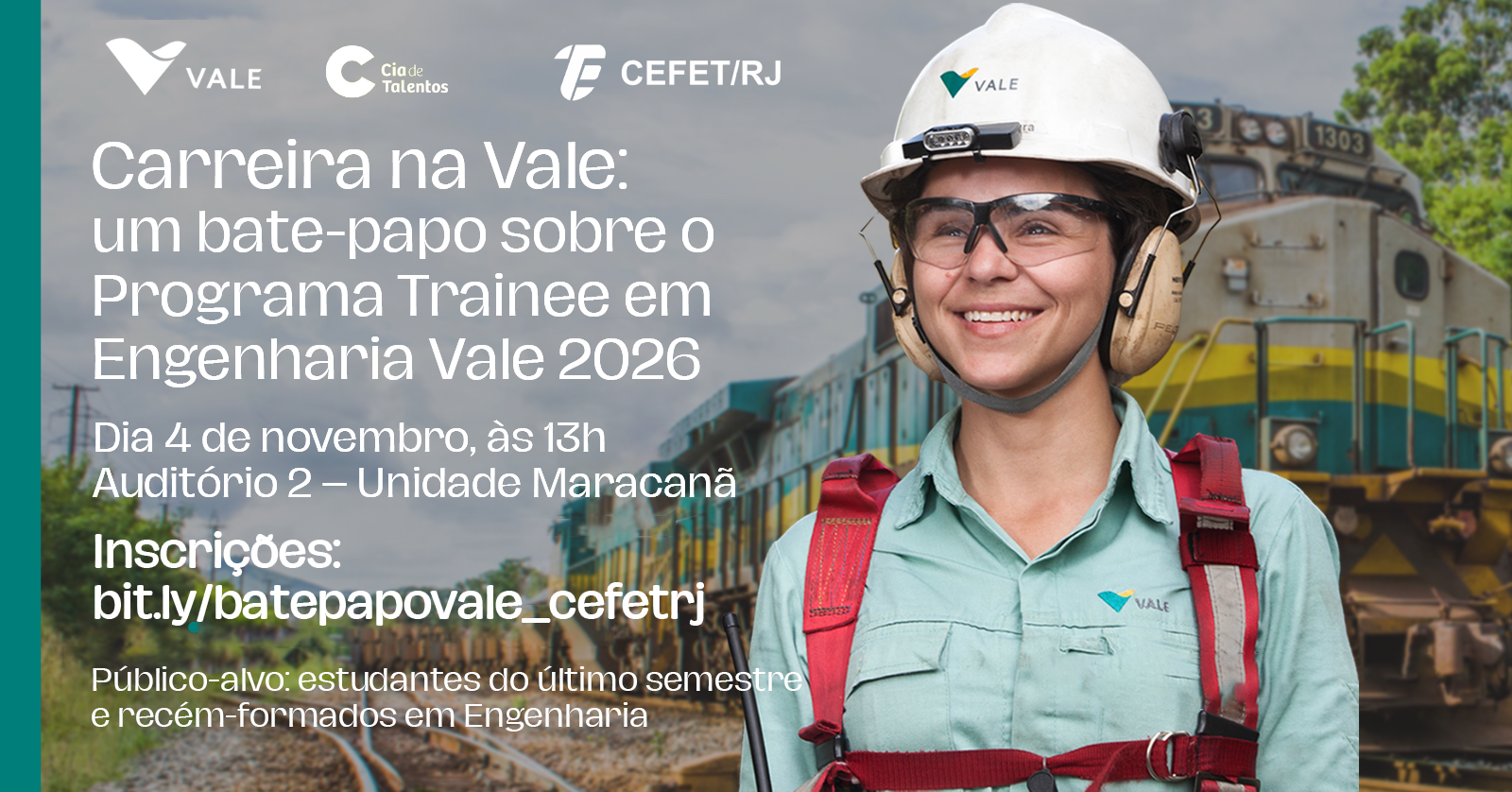 No dia 4 de novembro, a Unidade Maracanã vai sediar o evento “Carreira na Vale: um bate-papo sobre o Programa Trainee em Engenharia Vale 2026”, direcionado para estudantes do último semestre ou recém-formados em Engenharia. O evento é gratuito e terá início às 13h, no Auditório 2.