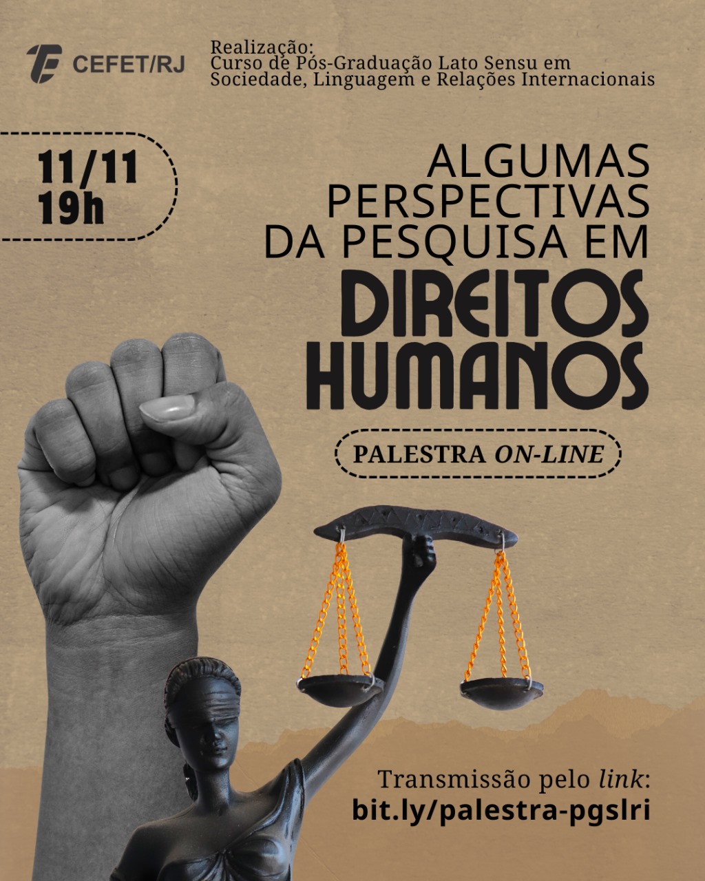 No dia 11 de outubro, às 19h, o curso de Pós-Graduação Lato Sensu em Sociedade, Linguagem e Relações Internacionais promoverá à palestra on-line “Algumas perspectivas da pesquisa em Direitos Humanos”. A palestra será ministrada pelo professor Danilo Junior de Oliveira, como conclusão do ciclo de disciplinas da turma iniciada em 2024.  A atividade é aberta ao público, em especial pesquisadores e demais interessados em ciências humanas e sociais, e as inscrições devem ser feitas até o dia 9 de outubro pelo formulário de inscrição.