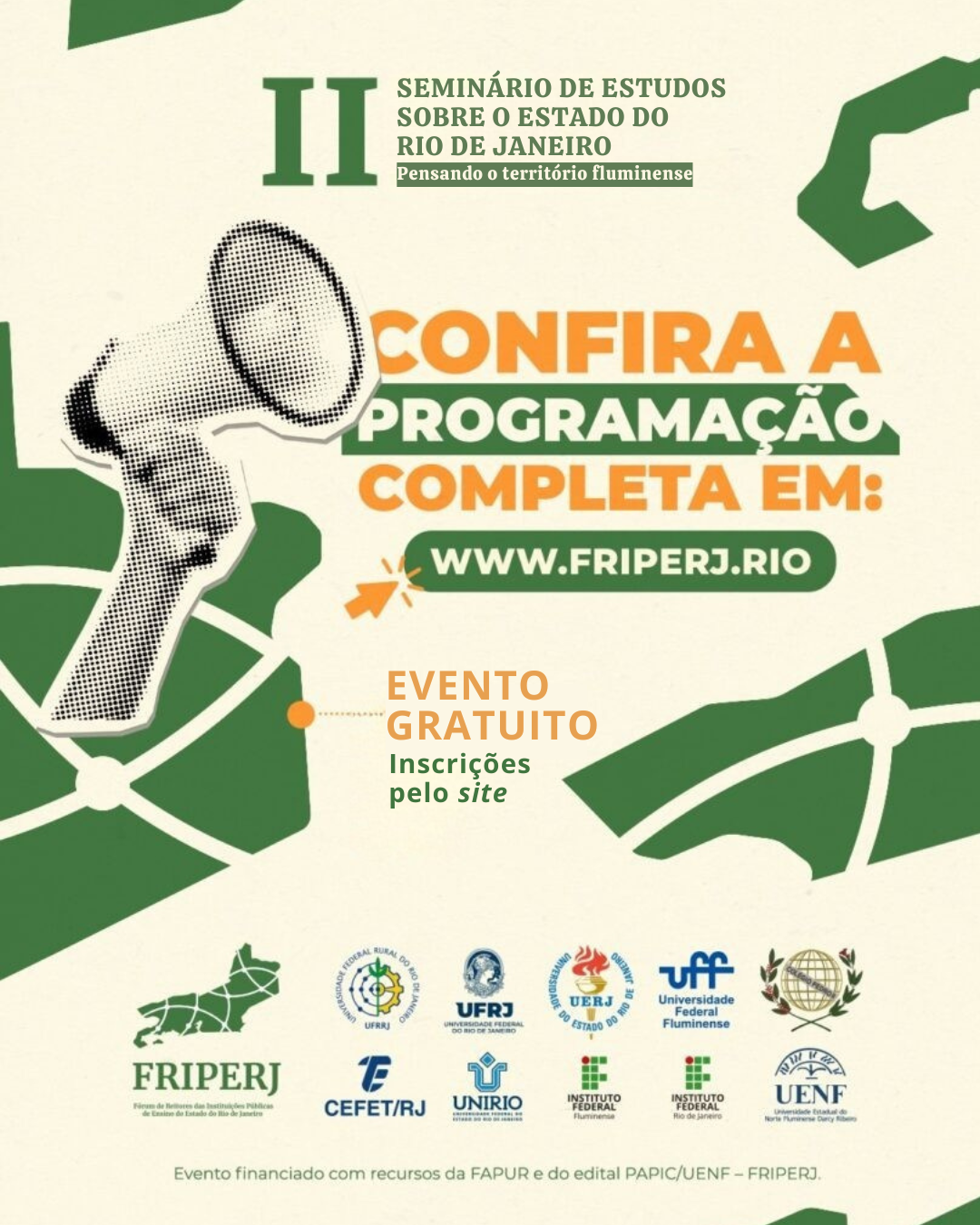 Com o tema “Pensando o território fluminense”, o II SEERJ reunirá pesquisadores, estudantes e representantes de instituições públicas de ensino superior do estado para debater os desafios e as perspectivas de desenvolvimento regional. A programação inclui quatro mesas com especialistas convidados e dezenas de sessões temáticas para apresentação dos 124 trabalhos aprovados pela comissão científica. Clique aqui para ver a programação completa do II SEERJ.