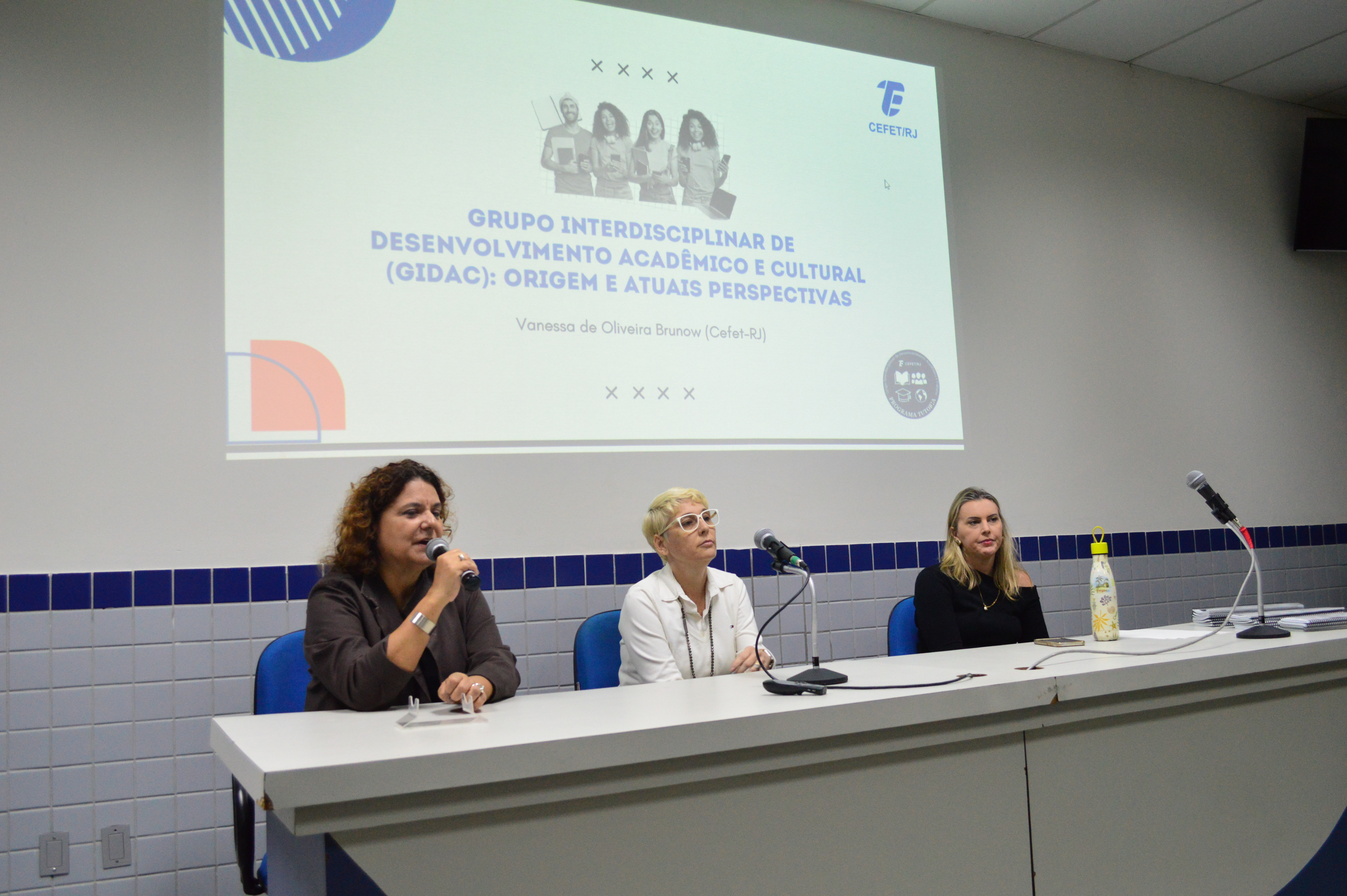 Da esq. para dir. Irene de Barcelos, chefe do Departamento de Ensino Médio e Técnico (DEMET), Dayse Pastora, diretora de Ensino (DIREN) e Vanessa Brunow (tutora e palestrante do evento)