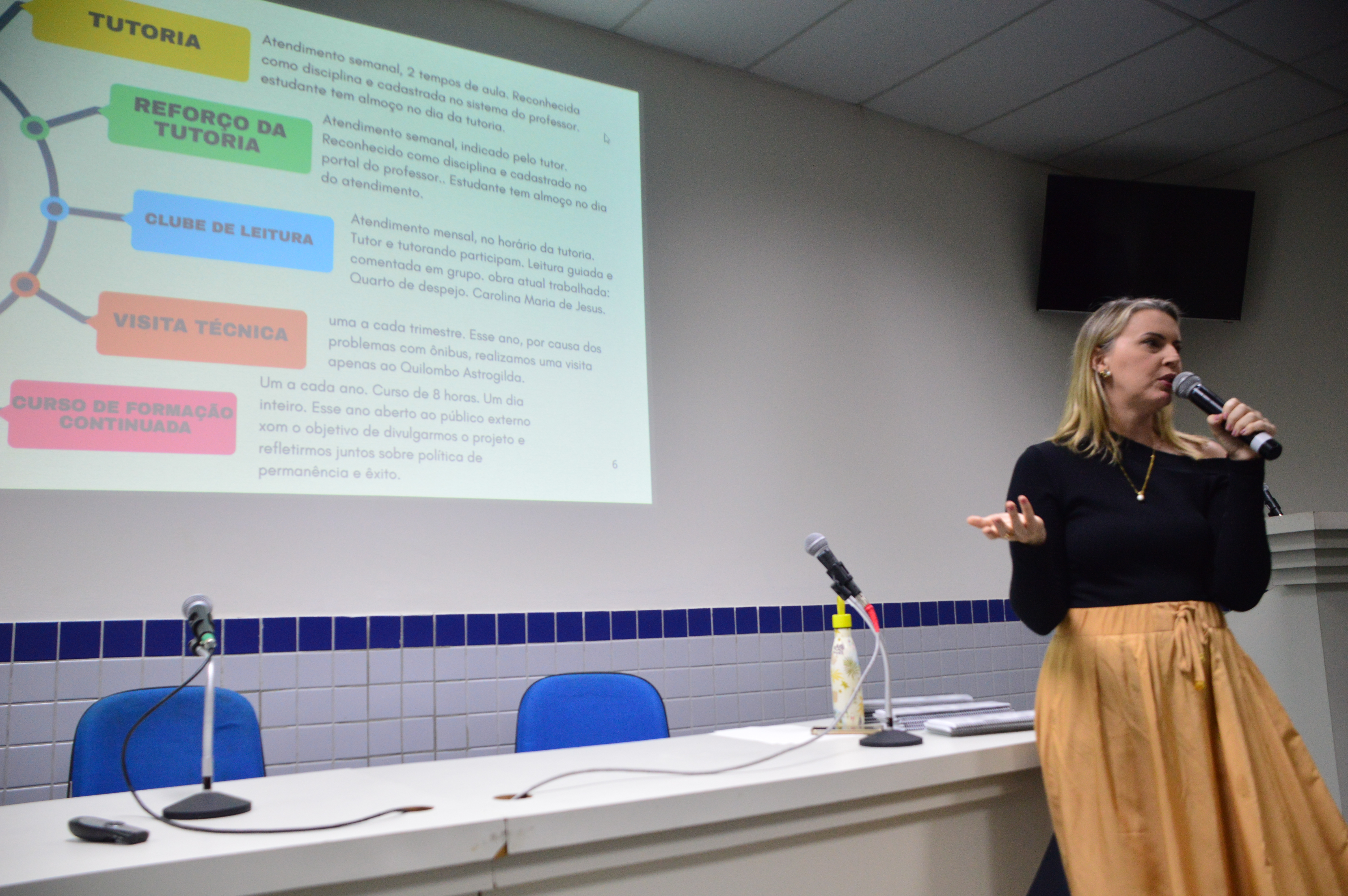 A professora Vanessa Brunow palestrou na abertura sobre os desafios do combate à evasão escolar a apresentou os avanços do projeto ao longo dos anos nas atividades de tutoria