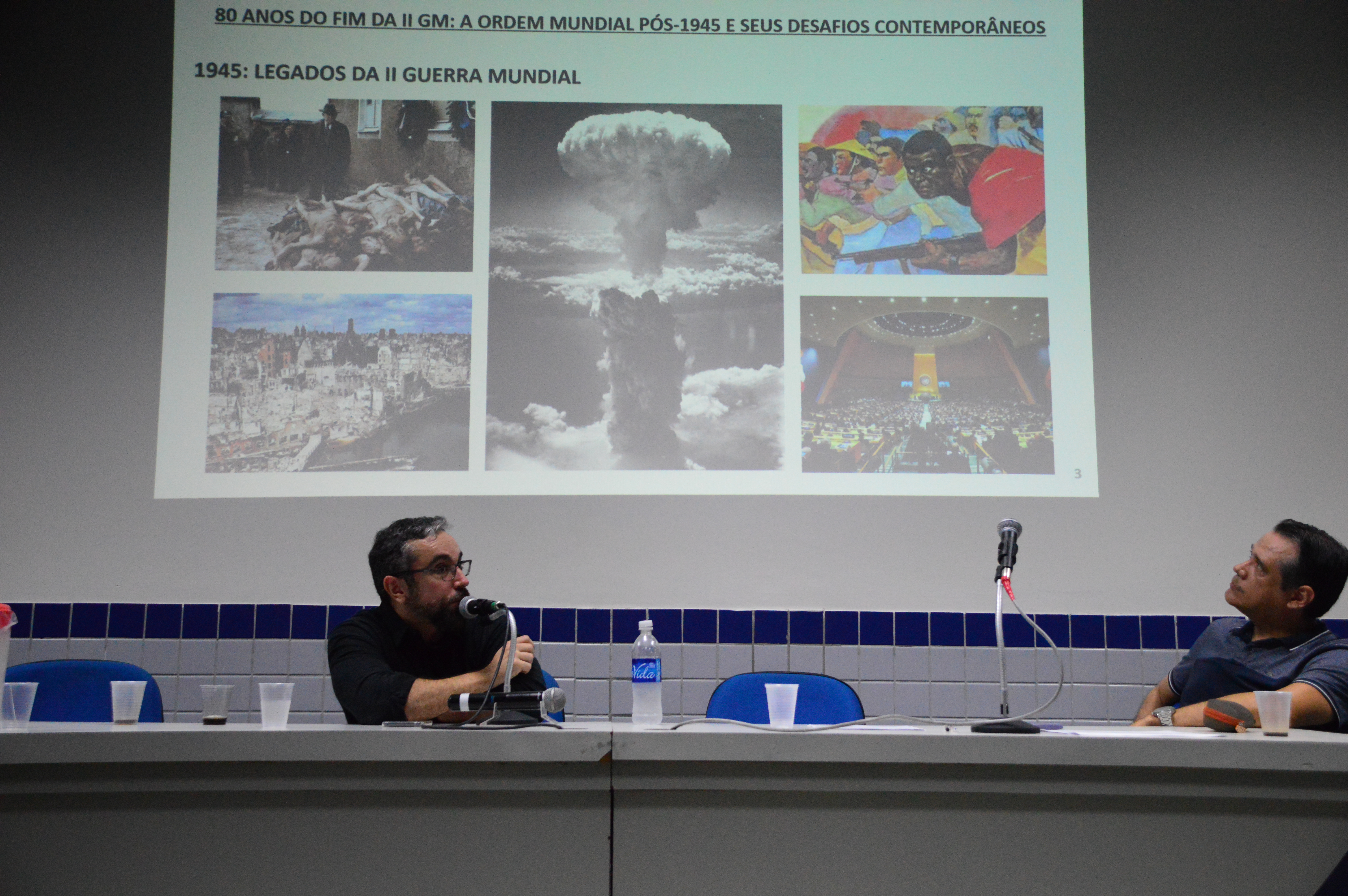 Doutor em Ciência Política e professor da UFF, João Rafael Morais (à esq.) falou sobre os 80 anos do fim da Segunda Guerra Mundial e os desafios contemporâneos da ordem mundial pós-1945