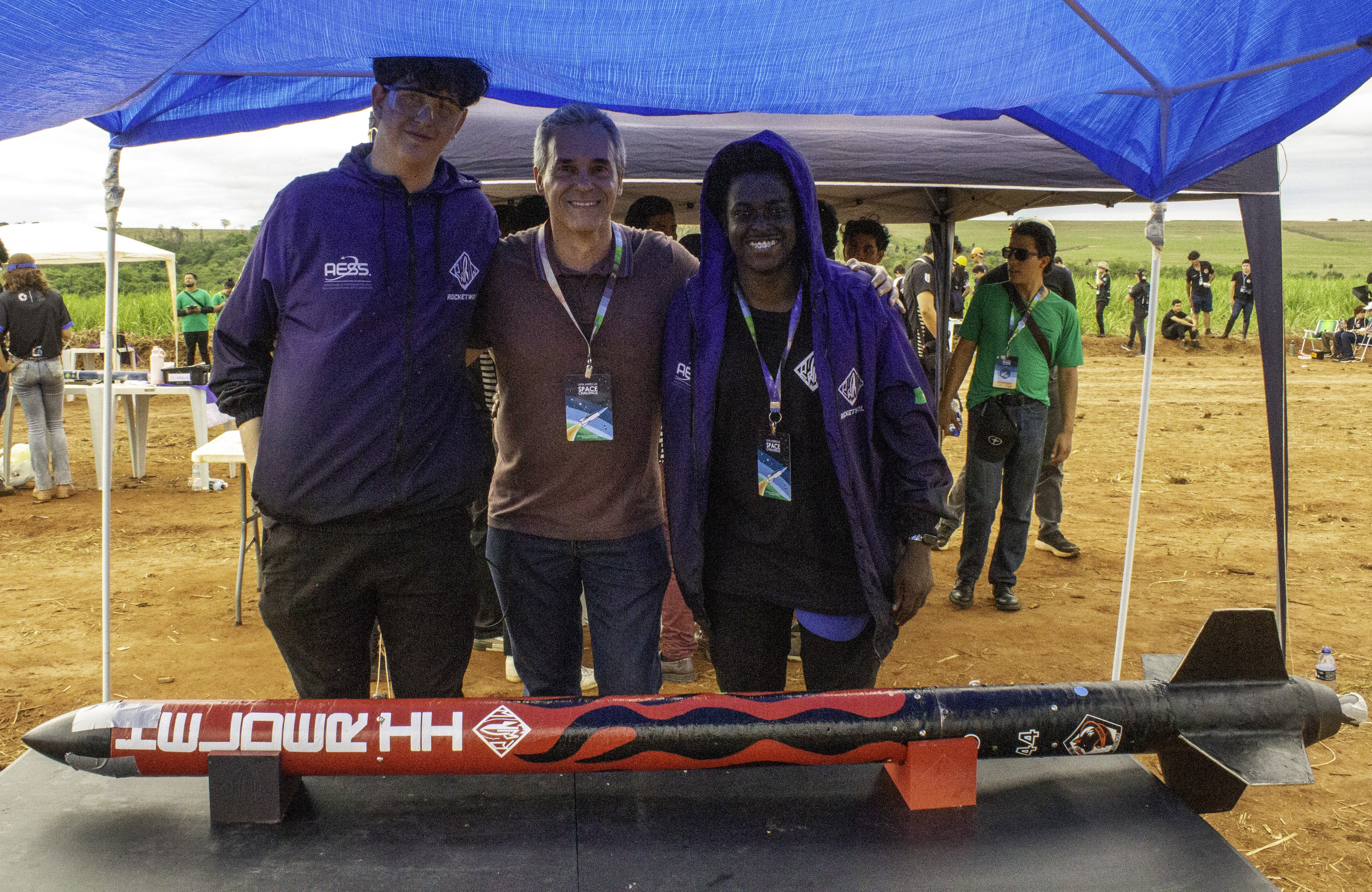 Foto 2: Da esq. para a dir.: Luis Otávio Erthal, vice-presidente da RocketWolf, Prof. Helder Manoel Venceslau, orientador, e Nathan Deodato, presidente da equipe, com o foguete Helder II