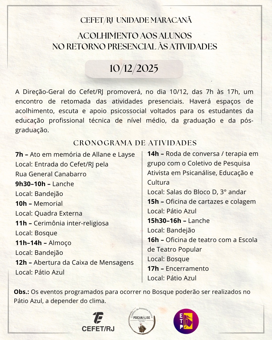 As ações contarão com a colaboração da Escola de Teatro Popular e do Coletivo de Pesquisa Ativista em Psicanálise, Educação e Cultura. O objetivo é contribuir nessa jornada de apoio mútuo, cuidado e fortalecimento de vínculos. Os eventos programados para ocorrer no bosque poderão ser realizados no Pátio Azul, a depender do clima.